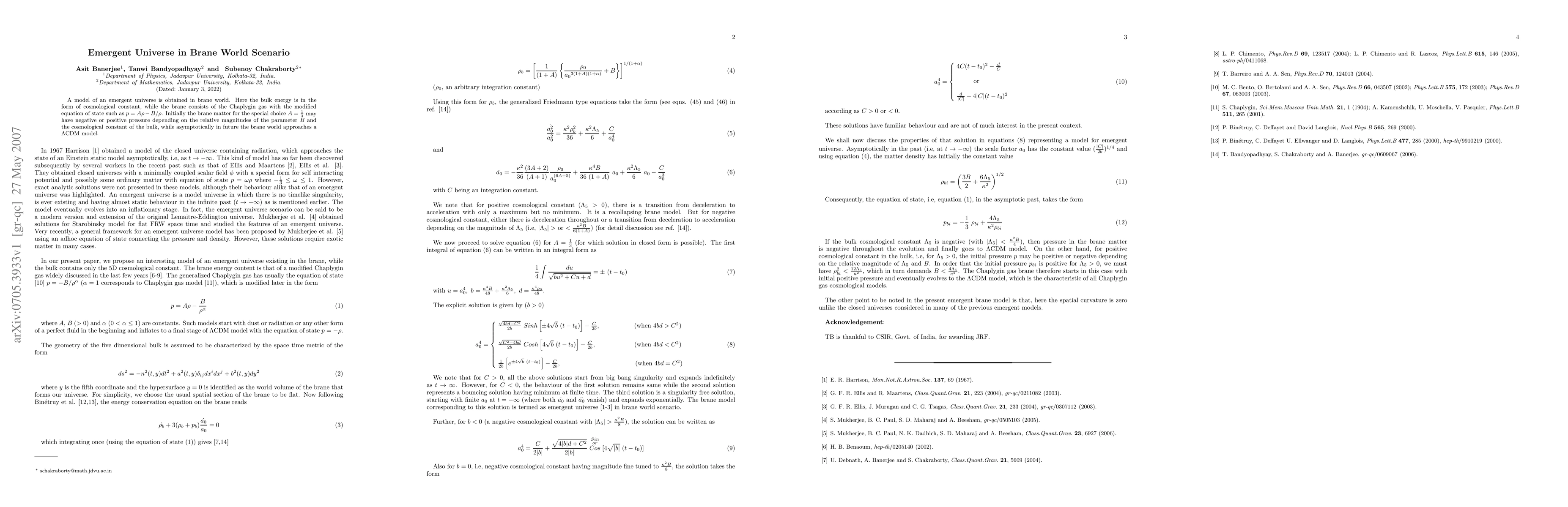 This paper proposes a model of an emergent universe within a brane world scenario where the bulk energy is a cosmological constant and the brane features a Chaplygin gas with a modified equation of state. The model shows that the brane universe can transition to a $\Lambda$CDM model in the future.
