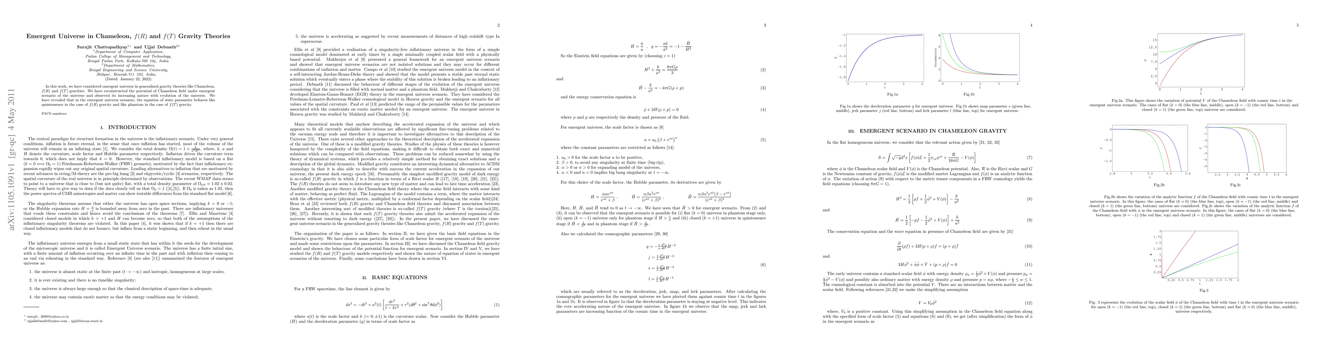 This research investigates the emergent universe model in chameleon, f(R), and f(T) gravity theories, reconstructing the chameleon field potential and finding its increasing nature over time. The study shows that the equation-of-state parameter mimics quintessence in f(R) gravity and phantom in f(T) gravity.