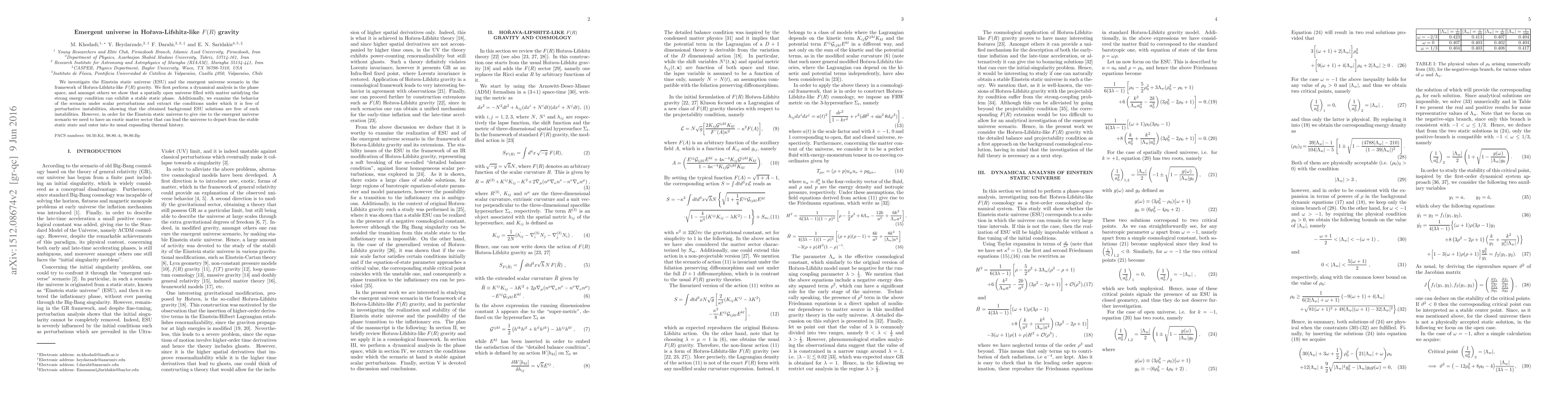 Researchers investigate a stable static phase in Horava-Lifshitz-like F(R) gravity, finding it can lead to an emergent universe scenario with exotic matter, but is free of perturbative instabilities.