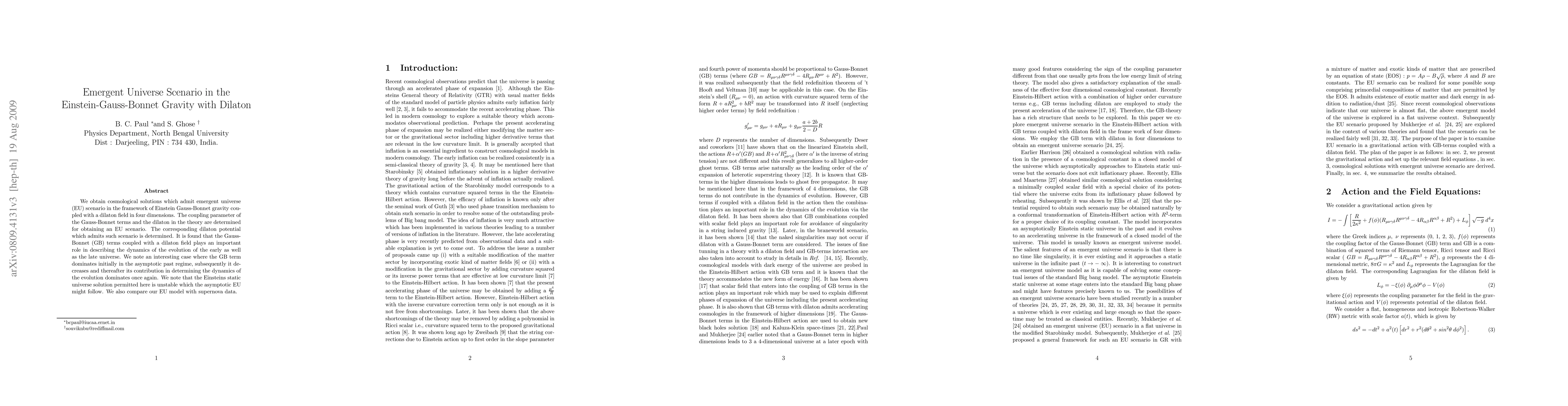 This paper explores cosmological solutions in Einstein-Gauss-Bonnet gravity coupled with a dilaton field, revealing an emergent universe scenario. The study determines the coupling parameters and dilaton potential, showing that Gauss-Bonnet terms significantly influence early and late universe dynamics, while the Einstein static universe solution is found to be unstable.