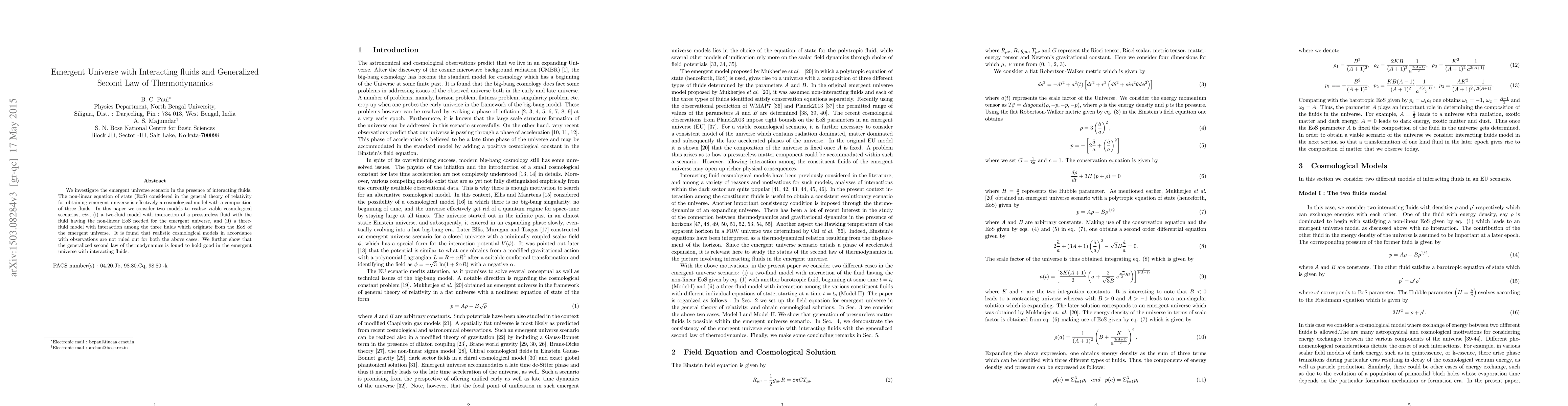 This paper explores the emergent universe scenario with interacting fluids, proposing two models: a two-fluid model and a three-fluid model. The study finds that both models can yield realistic cosmological models consistent with observations, and the generalized second law of thermodynamics holds in these scenarios.