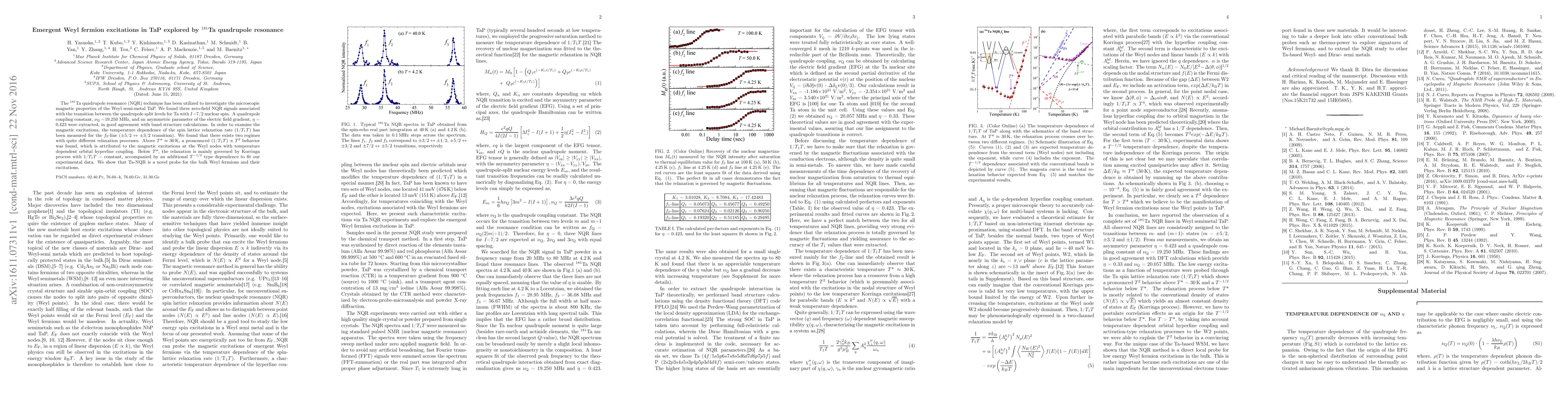 The study utilizes $^{181}$Ta quadrupole resonance to investigate TaP's magnetic properties, revealing three zero-field signals linked to Weyl semi-metal excitations. The temperature-dependent spin lattice relaxation rate indicates two distinct relaxation regimes, attributing the $T^2$ behavior above 30 K to Weyl node magnetic excitations.