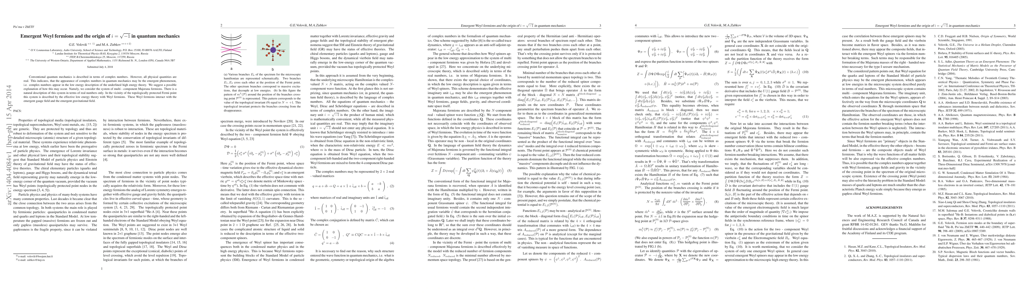 This paper explores the emergence of complex numbers in quantum mechanics, suggesting they arise from a low-energy description of a high-energy theory involving Majorana fermions. The system, near a topologically protected Fermi point, exhibits Weyl fermions that interact with emergent gauge and gravitational fields.