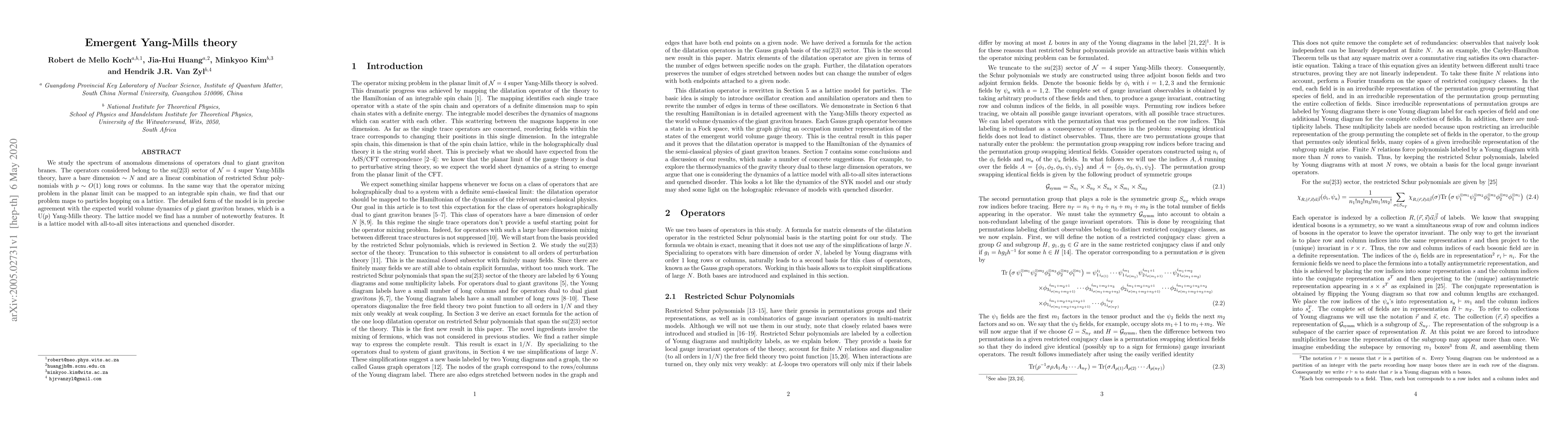 We study the spectrum of anomalous dimensions of operators dual to giant graviton branes. The operators considered belong to the su$(2|3)$ sector of ${\cal N}=4$ super Yang-Mills theory, have a bare dimension $\sim N$ and are a linear combination of restricted Schur polynomials with $p\sim O(1)$ long rows or columns. In the same way that the operator mixing problem in the planar limit can be mapped to an integrable spin chain, we find that our problem maps to particles hopping on a lattice. The detailed form of the model is in precise agreement with the expected world volume dynamics of $p$ giant graviton branes, which is a U$(p)$ Yang-Mills theory. The lattice model we find has a number of noteworthy features. It is a lattice model with all-to-all sites interactions and quenched disorder.