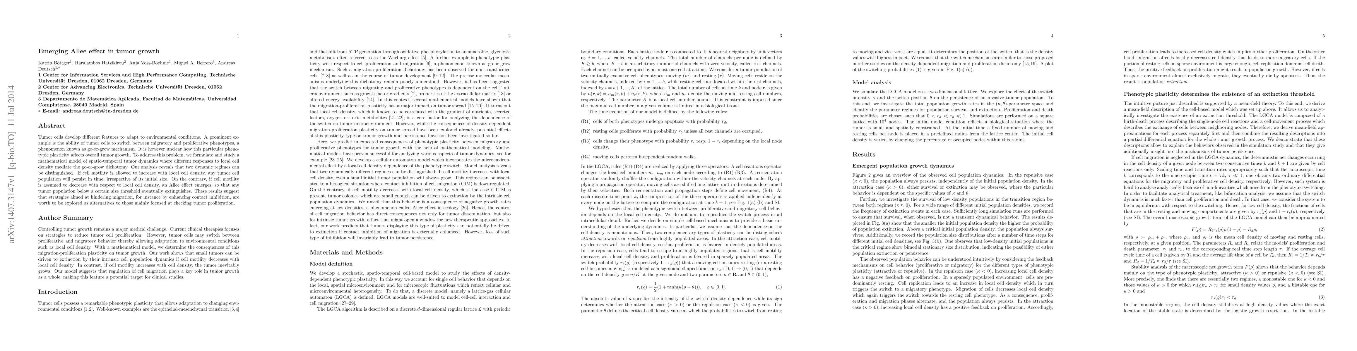 Tumor cells develop different features to adapt to environmental conditions. A prominent example is the ability of tumor cells to switch between migratory and proliferative phenotypes, a phenomenon known as go-or-grow mechanism. It is however unclear how this particular phenotypic plasticity affects overall tumor growth. To address this problem, we formulate and study a mathematical model of spatio-temporal tumor dynamics where different responses to local cell density mediate the go-or-grow dichotomy. Our analysis reveals that two dynamic regimes can be distinguished. If cell motility is allowed to increase with local cell density, any tumor cell population will persist in time, irrespective of its initial size. On the contrary, if cell motility is assumed to decrease with respect to local cell density, an Allee effect emerges, so that any tumor population below a certain size threshold eventually extinguishes. These results suggest that strategies aimed at hindering migration, for instance by enhancing contact inhibition, are worth to be explored as alternatives to those mainly focused at checking tumor proliferation.
