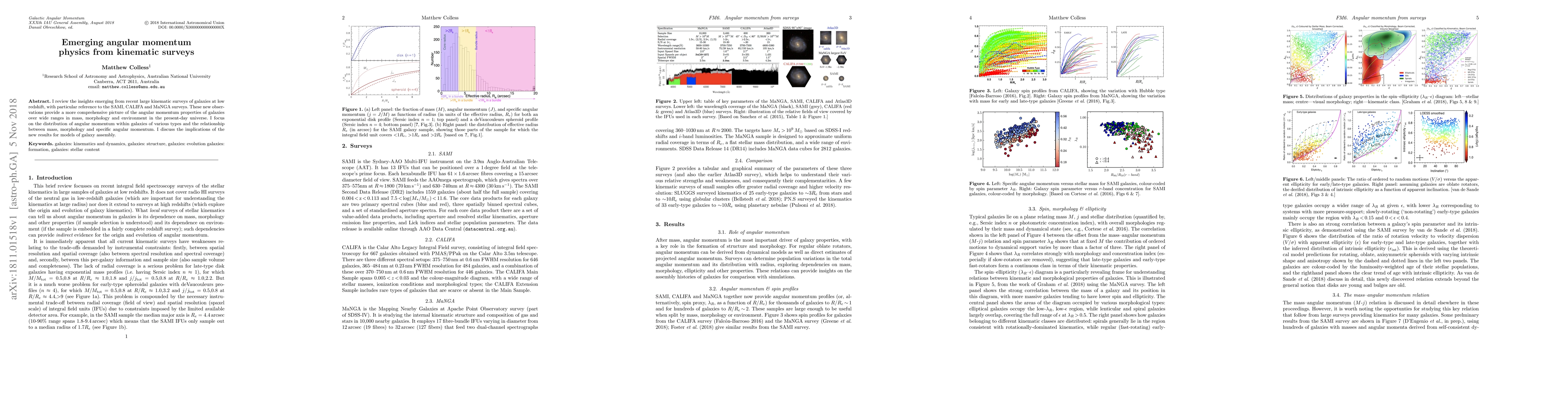 I review the insights emerging from recent large kinematic surveys of galaxies at low redshift, with particular reference to the SAMI, CALIFA and MaNGA surveys. These new observations provide a more comprehensive picture of the angular momentum properties of galaxies over wide ranges in mass, morphology and environment in the present-day universe. I focus on the distribution of angular momentum within galaxies of various types and the relationship between mass, morphology and specific angular momentum. I discuss the implications of the new results for models of galaxy assembly.