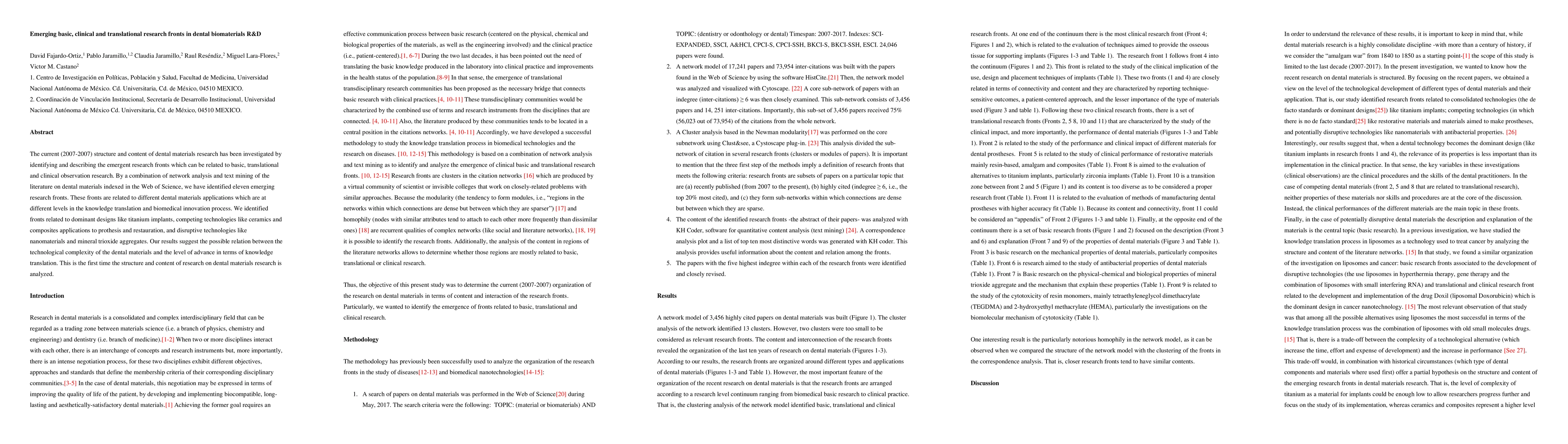 This paper analyzes the emerging research fronts in dental biomaterials, identifying eleven key areas through network analysis and text mining. These fronts span basic, clinical, and translational research, focusing on advanced materials like titanium implants, ceramics, composites, nanomaterials, and mineral trioxide aggregates, highlighting the correlation between technological complexity and knowledge translation progress.