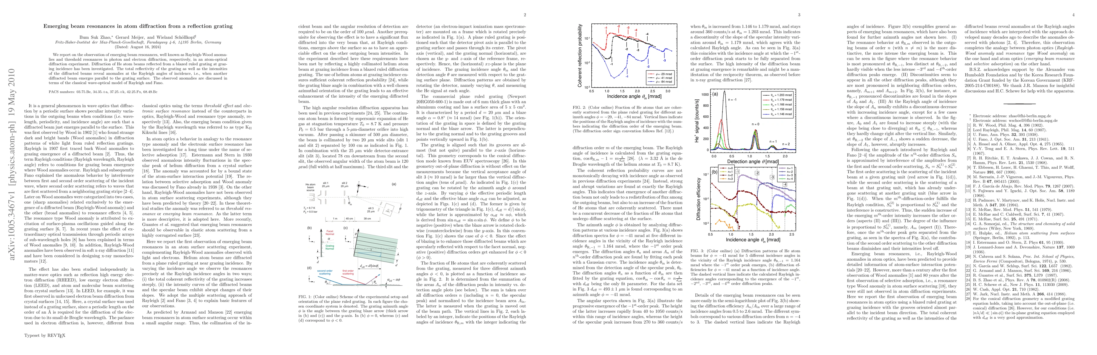 We report on the observation of emerging beam resonances, well known as Rayleigh-Wood anomalies and threshold resonances in photon and electron diffraction, respectively, in an atom-optical diffraction experiment. Diffraction of He atom beams reflected from a blazed ruled grating at grazing incidence has been investigated. The total reflectivity of the grating as well as the intensities of the diffracted beams reveal anomalies at the Rayleigh angles of incidence, i.e., when another diffracted beam merges parallel to the grating surface. The observed anomalies are discussed in terms of the classical wave-optical model of Rayleigh and Fano.