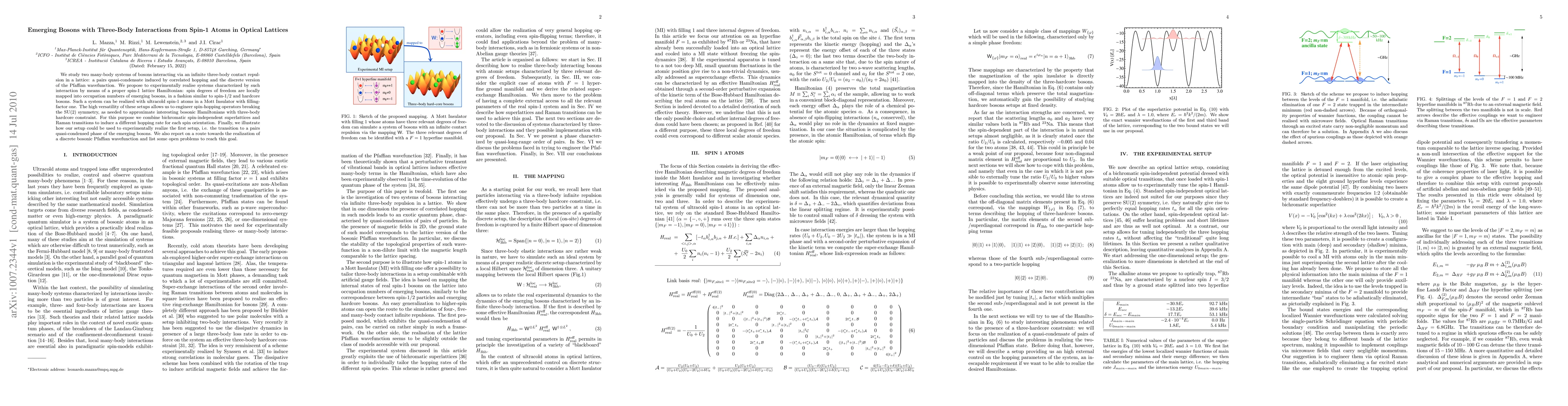 This paper explores the creation of many-body systems of bosons with three-body interactions in optical lattices using spin-1 atoms, proposing a lattice Hamiltonian to realize these interactions. It outlines a method to engineer spin-hopping operators to achieve a pairs quasi-condensate phase and discusses the potential for realizing a discrete Pfaffian wavefunction.