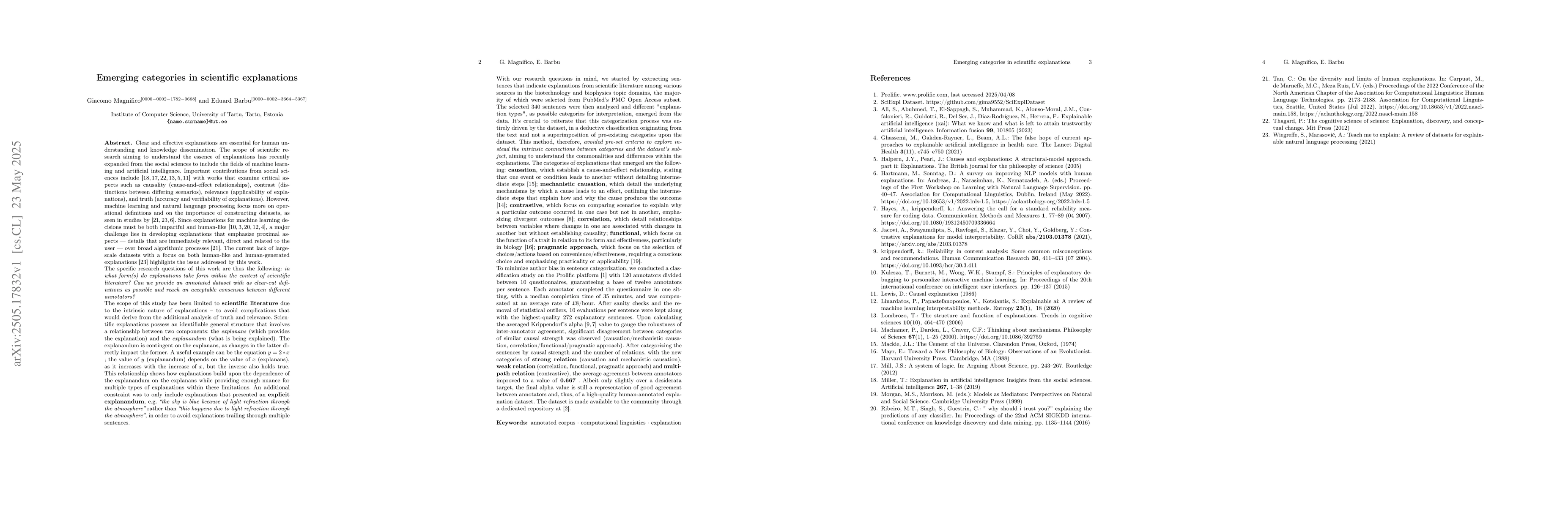Clear and effective explanations are essential for human understanding and knowledge dissemination. The scope of scientific research aiming to understand the essence of explanations has recently expanded from the social sciences to machine learning and artificial intelligence. Explanations for machine learning decisions must be impactful and human-like, and there is a lack of large-scale datasets focusing on human-like and human-generated explanations. This work aims to provide such a dataset by: extracting sentences that indicate explanations from scientific literature among various sources in the biotechnology and biophysics topic domains (e.g. PubMed's PMC Open Access subset); providing a multi-class notation derived inductively from the data; evaluating annotator consensus on the emerging categories. The sentences are organized in an openly-available dataset, with two different classifications (6-class and 3-class category annotation), and the 3-class notation achieves a 0.667 Krippendorf Alpha value.