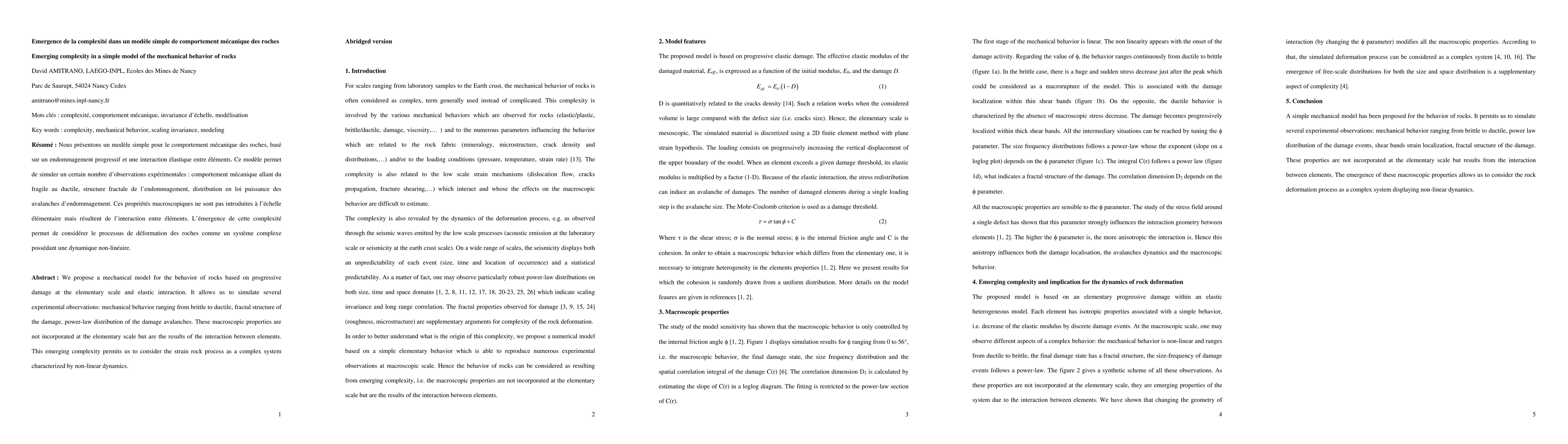 We propose a mechanical model for the behaviour of rocks based on progressive damage at the elementary scale and elastic interaction. It allows us to simulate several experimental observations: mechanical behaviour ranging from brittle to ductile, fractal structure of the damage, powerlaw distribution of the damage avalanches. These macroscopic properties are not incorporated at the elementary scale, but are the results of the interaction between elements. This emerging complexity permits us to consider the strain rock process as a complex system characterized by non-linear dynamics.
