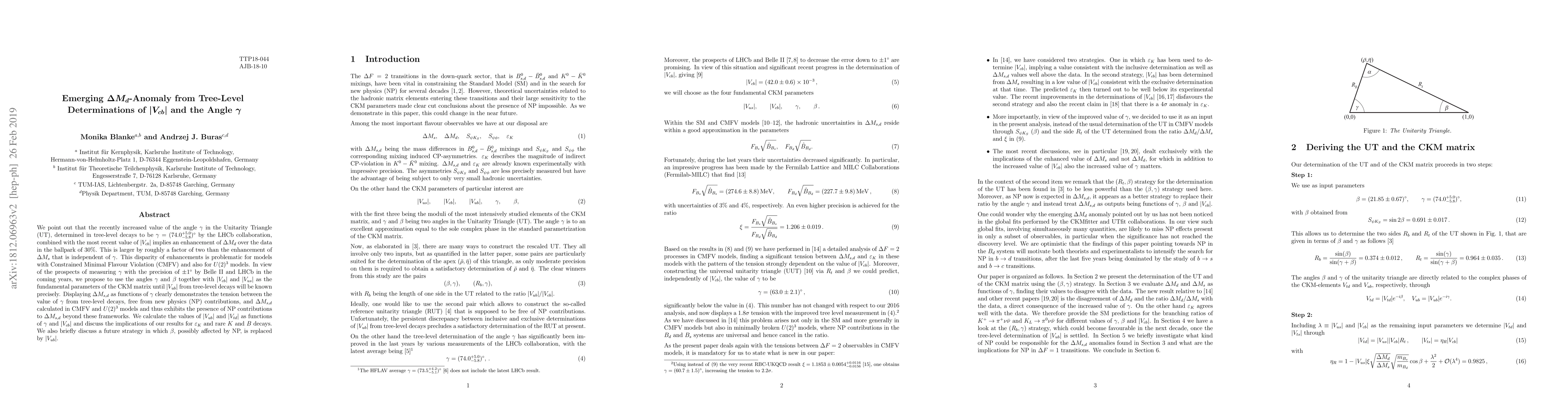 We point out that the recently increased value of the angle $\gamma$ in the Unitarity Triangle (UT), determined in tree-level decays to be $\gamma=(74.0^{+5.0}_{-5.8})^\circ$ by the LHCb collaboration, combined with the most recent value of $|V_{cb}|$ implies an enhancement of $\Delta M_{d}$ over the data in the ballpark of $30\%$. This is roughly by a factor of two larger than the enhancement of $\Delta M_{s}$ that is independent of $\gamma$. This disparity of enhancements is problematic for models with Constrained Minimal Flavour Violation (CMFV) and also for $U(2)^3$ models. In view of the prospects of measuring $\gamma$ with the precision of $\pm 1^\circ$ by Belle II and LHCb in the coming years, we propose to use the angles $\gamma$ and $\beta$ together with $|V_{cb}|$ and $|V_{us}|$ as the fundamental parameters of the CKM matrix until $|V_{ub}|$ from tree-level decays will be known precisely. Displaying $\Delta M_{s,d}$ as functions of $\gamma$ clearly demonstrates the tension between the value of $\gamma$ from tree-level decays, free from new physics (NP) contributions, and $\Delta M_{s,d}$ calculated in CMFV and $U(2)^3$ models and thus exhibits the presence of NP contributions to $\Delta M_{s,d}$ beyond these frameworks. We calculate the values of $|V_{ub}|$ and $|V_{td}|$ as functions of $\gamma$ and $|V_{cb}|$ and discuss the implications of our results for $\varepsilon_K$ and rare $K$ and $B$ decays. We also briefly discuss a future strategy in which $\beta$, possibly affected by NP, is replaced by $|V_{ub}|$.
