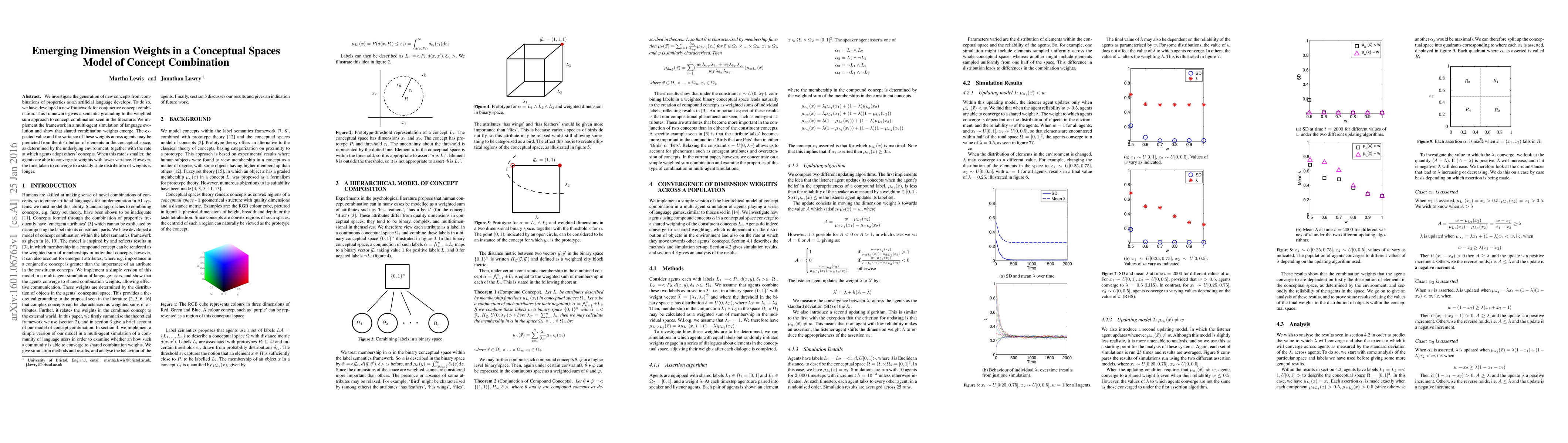 We investigate the generation of new concepts from combinations of properties as an artificial language develops. To do so, we have developed a new framework for conjunctive concept combination. This framework gives a semantic grounding to the weighted sum approach to concept combination seen in the literature. We implement the framework in a multi-agent simulation of language evolution and show that shared combination weights emerge. The expected value and the variance of these weights across agents may be predicted from the distribution of elements in the conceptual space, as determined by the underlying environment, together with the rate at which agents adopt others' concepts. When this rate is smaller, the agents are able to converge to weights with lower variance. However, the time taken to converge to a steady state distribution of weights is longer.