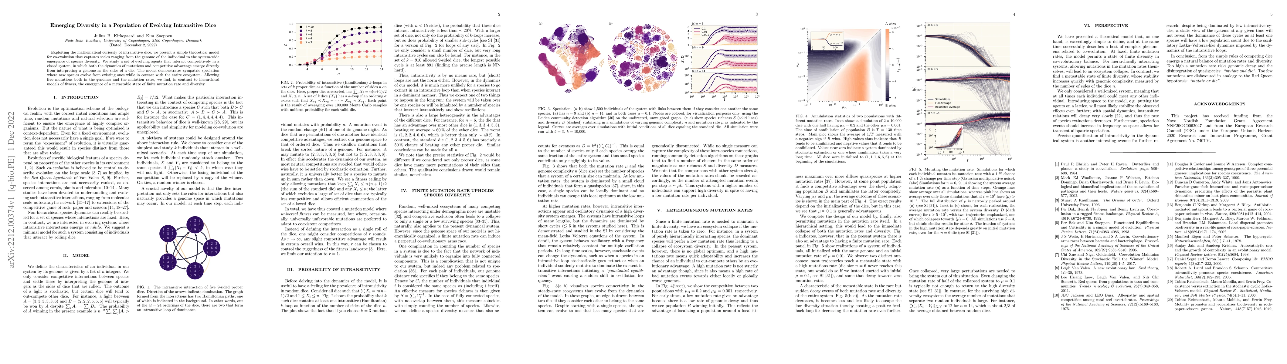 Exploiting the mathematical curiosity of intransitive dice, we present a simple theoretical model for co-evolution that captures scales ranging from the genome of the individual to the system-wide emergence of species diversity. We study a set of evolving agents that interact competitively in a closed system, in which both the dynamics of mutations and competitive advantage emerge directly from interpreting a genome as the sides of a die. The model demonstrates sympatric speciation where new species evolve from existing ones while in contact with the entire ecosystem. Allowing free mutations both in the genomes and the mutation rates, we find, in contrast to hierarchical models of fitness, the emergence of a metastable state of finite mutation rate and diversity.