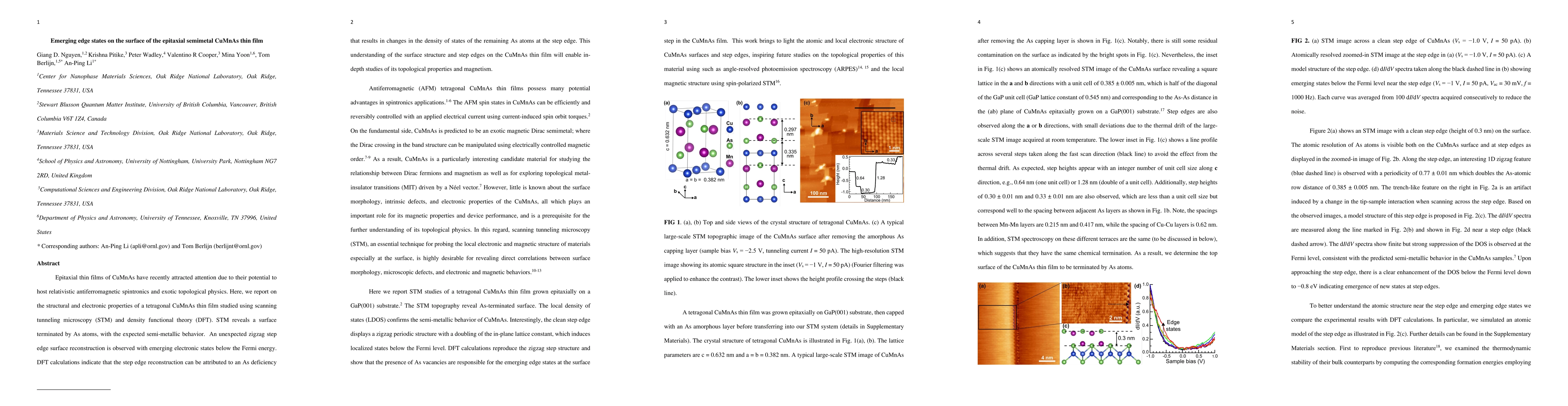 This study investigates the structural and electronic properties of epitaxial CuMnAs thin films using STM and DFT, revealing a zigzag edge reconstruction and emerging edge states below the Fermi level due to As deficiency, which impacts the material's topological properties and magnetism.