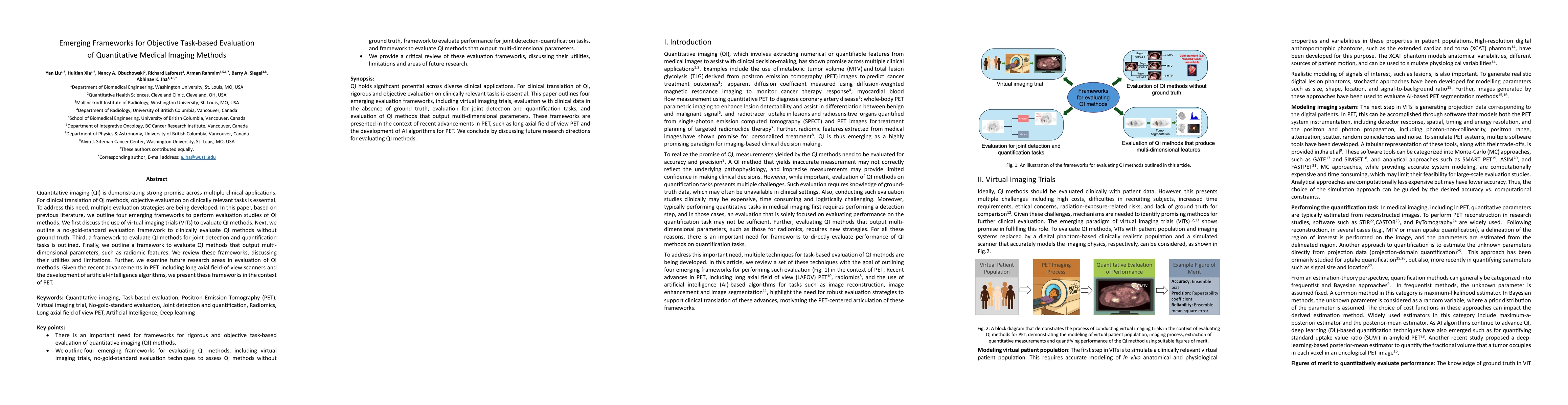 Quantitative imaging (QI) is demonstrating strong promise across multiple clinical applications. For clinical translation of QI methods, objective evaluation on clinically relevant tasks is essential. To address this need, multiple evaluation strategies are being developed. In this paper, based on previous literature, we outline four emerging frameworks to perform evaluation studies of QI methods. We first discuss the use of virtual imaging trials (VITs) to evaluate QI methods. Next, we outline a no-gold-standard evaluation framework to clinically evaluate QI methods without ground truth. Third, a framework to evaluate QI methods for joint detection and quantification tasks is outlined. Finally, we outline a framework to evaluate QI methods that output multi-dimensional parameters, such as radiomic features. We review these frameworks, discussing their utilities and limitations. Further, we examine future research areas in evaluation of QI methods. Given the recent advancements in PET, including long axial field-of-view scanners and the development of artificial-intelligence algorithms, we present these frameworks in the context of PET.