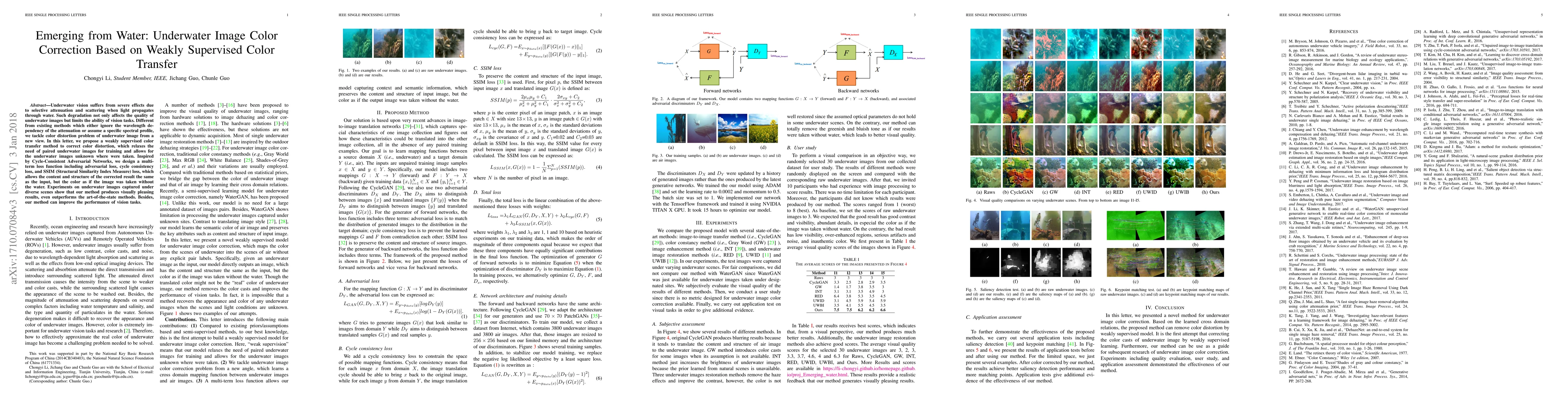 This paper proposes a weakly supervised color transfer method for correcting color distortion in underwater images, addressing the wavelength dependency of light attenuation without requiring paired training data. The method employs a multi-term loss function, including adversarial, cycle consistency, and SSIM losses, achieving visually pleasing results and outperforming existing state-of-the-art techniques.