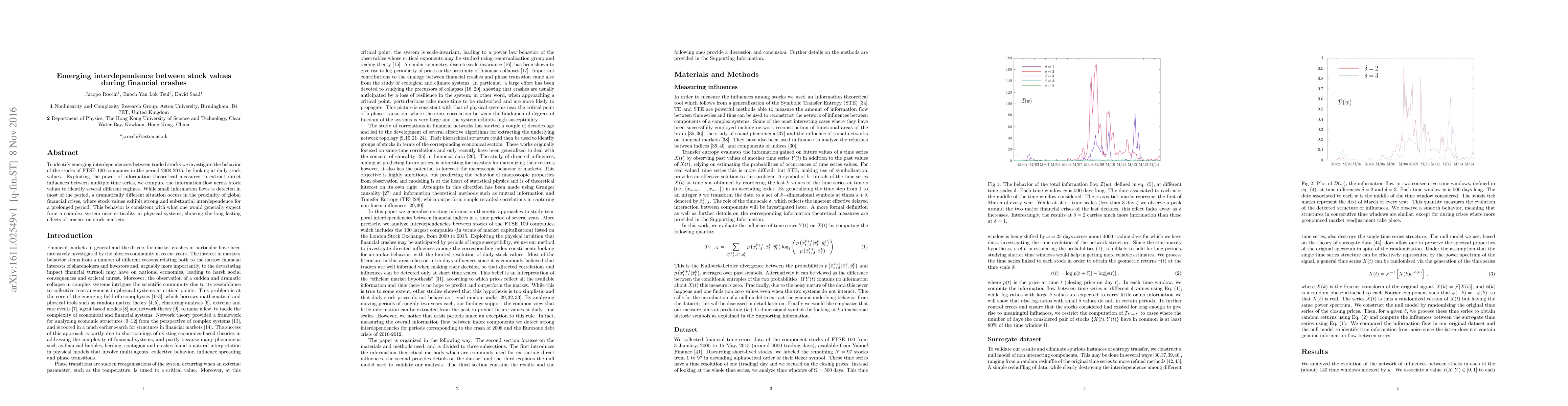 To identify emerging interdependencies between traded stocks we investigate the behavior of the stocks of FTSE 100 companies in the period 2000-2015, by looking at daily stock values. Exploiting the power of information theoretical measures to extract direct influences between multiple time series, we compute the information flow across stock values to identify several different regimes. While small information flows is detected in most of the period, a dramatically different situation occurs in the proximity of global financial crises, where stock values exhibit strong and substantial interdependence for a prolonged period. This behavior is consistent with what one would generally expect from a complex system near criticality in physical systems, showing the long lasting effects of crashes on stock markets.