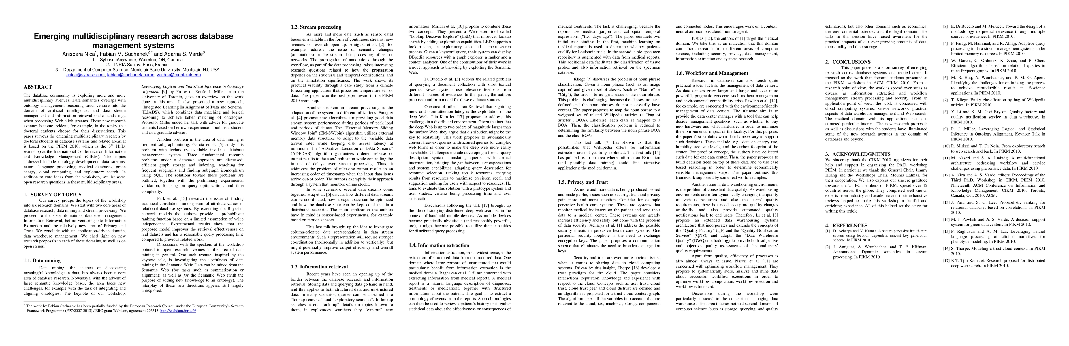 This paper surveys emerging multidisciplinary research in database management systems, highlighting intersections with ontology, AI, data streams, and information retrieval. It focuses on doctoral dissertation topics from the PIKM 2010 workshop, addressing areas like ontology development, cloud computing, and exploratory search, while also identifying open research questions.