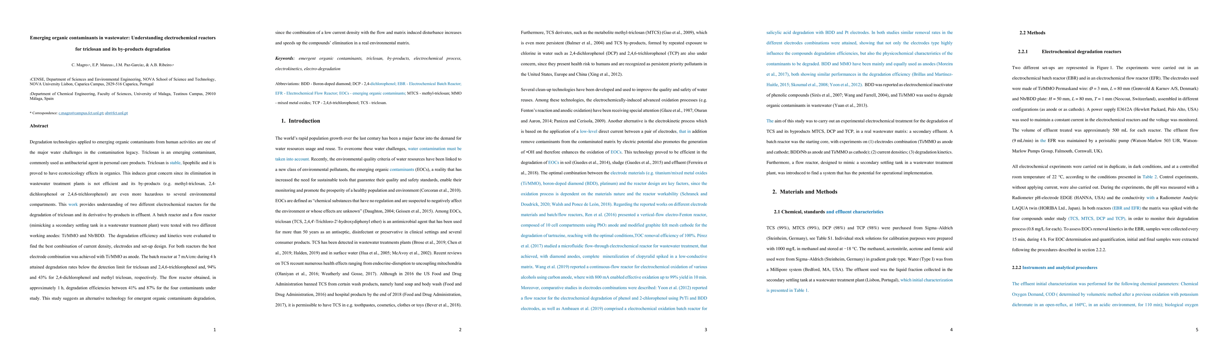 This paper investigates the degradation of triclosan and its hazardous by-products in wastewater using electrochemical reactors. Both batch and flow reactors with Ti/MMO and Nb/BDD anodes were tested, showing that Ti/MMO anodes achieved the best degradation efficiency, especially in the batch reactor, which reached near complete elimination of triclosan and its derivatives.