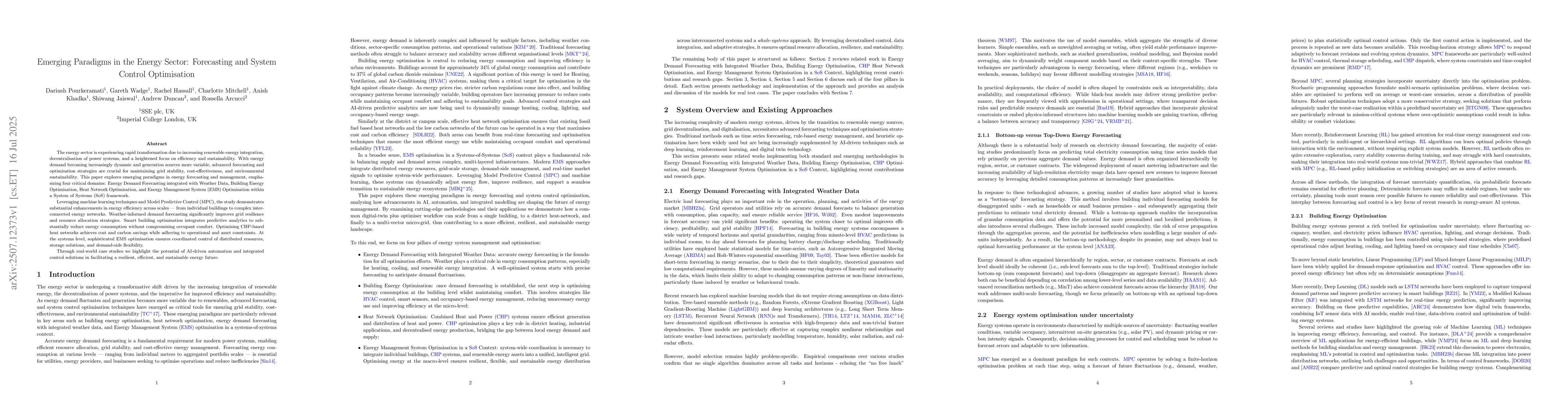 The energy sector is experiencing rapid transformation due to increasing renewable energy integration, decentralisation of power systems, and a heightened focus on efficiency and sustainability. With energy demand becoming increasingly dynamic and generation sources more variable, advanced forecasting and optimisation strategies are crucial for maintaining grid stability, cost-effectiveness, and environmental sustainability. This paper explores emerging paradigms in energy forecasting and management, emphasizing four critical domains: Energy Demand Forecasting integrated with Weather Data, Building Energy Optimisation, Heat Network Optimisation, and Energy Management System (EMS) Optimisation within a System of Systems (SoS) framework. Leveraging machine learning techniques and Model Predictive Control (MPC), the study demonstrates substantial enhancements in energy efficiency across scales -- from individual buildings to complex interconnected energy networks. Weather-informed demand forecasting significantly improves grid resilience and resource allocation strategies. Smart building optimisation integrates predictive analytics to substantially reduce energy consumption without compromising occupant comfort. Optimising CHP-based heat networks achieves cost and carbon savings while adhering to operational and asset constraints. At the systems level, sophisticated EMS optimisation ensures coordinated control of distributed resources, storage solutions, and demand-side flexibility. Through real-world case studies we highlight the potential of AI-driven automation and integrated control solutions in facilitating a resilient, efficient, and sustainable energy future.