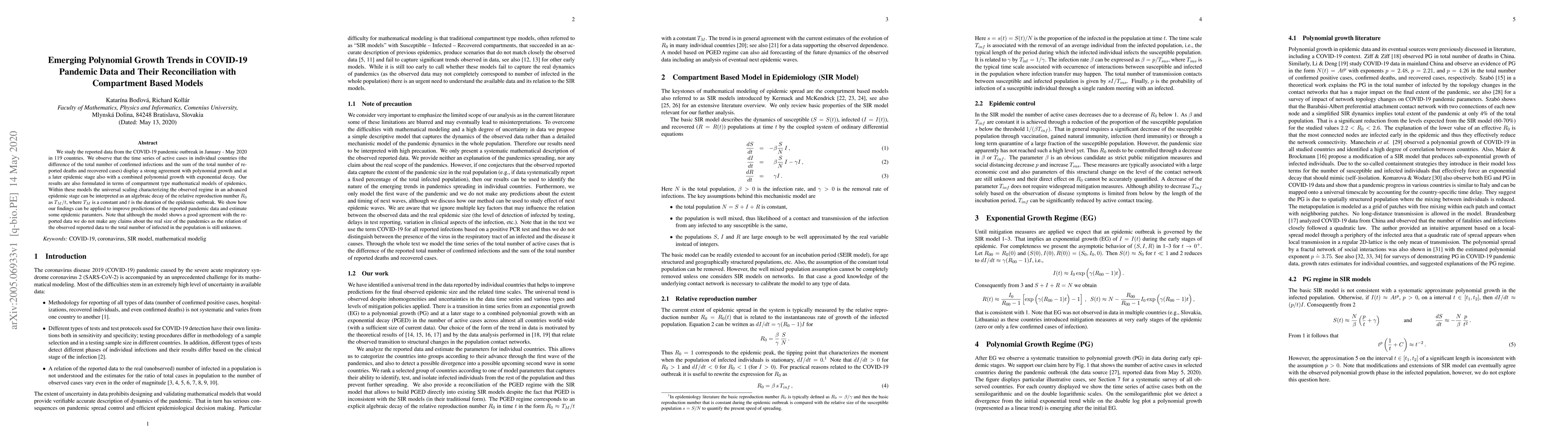 This paper analyzes COVID-19 data from January to May 2020 in 119 countries, finding that active cases follow polynomial growth trends, transitioning to polynomial growth with exponential decay in later stages. The findings reconcile with compartment-based epidemic models, suggesting an algebraic decay of the relative reproduction number.