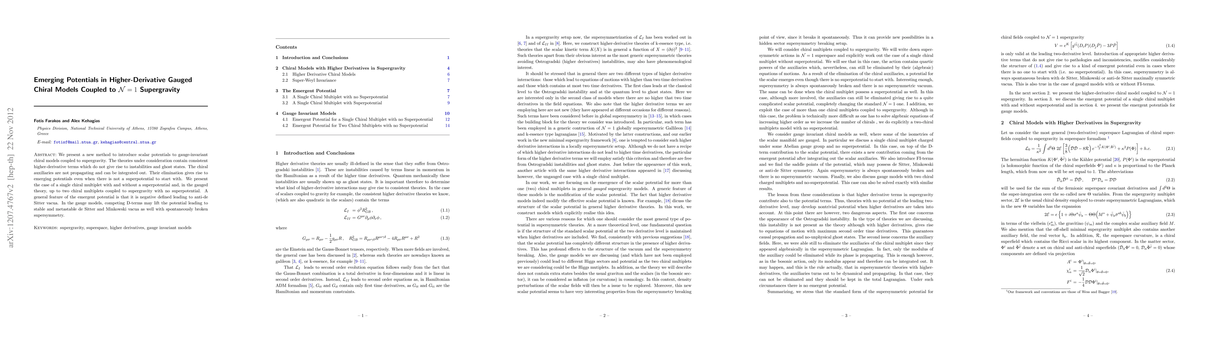 We present a new method to introduce scalar potentials to gauge-invariant chiral models coupled to supergravity. The theories under consideration contain consistent higher-derivative terms which do not give rise to instabilities and ghost states. The chiral auxiliaries are not propagating and can be integrated out. Their elimination gives rise to emerging potentials even when there is not a superpotential to start with. We present the case of a single chiral multiplet with and without a superpotential and, in the gauged theory, up to two chiral multiplets coupled to supergravity with no superpotential. A general feature of the emergent potential is that it is negative defined leading to anti-de Sitter vacua. In the gauge models, competing D-terms may lift the potential leading to stable and metastable de Sitter and Minkowski vacua as well with spontaneously broken supersymmetry.