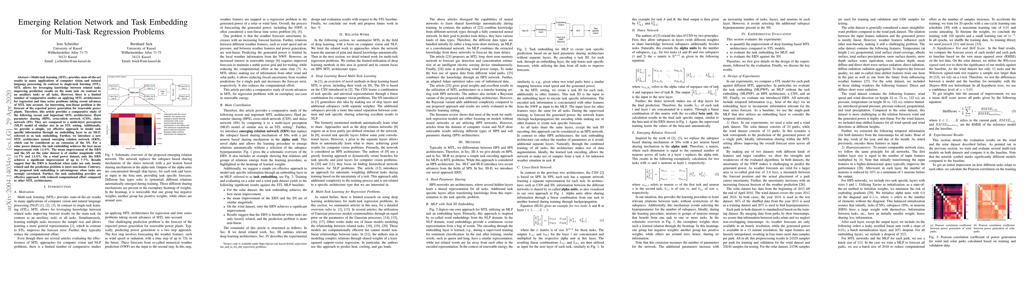 Multi-task learning (mtl) provides state-of-the-art results in many applications of computer vision and natural language processing. In contrast to single-task learning (stl), mtl allows for leveraging knowledge between related tasks improving prediction results on the main task (in contrast to an auxiliary task) or all tasks. However, there is a limited number of comparative studies on applying mtl architectures for regression and time series problems taking recent advances of mtl into account. An interesting, non-linear problem is the forecast of the expected power generation for renewable power plants. Therefore, this article provides a comparative study of the following recent and important mtl architectures: Hard parameter sharing, cross-stitch network, sluice network (sn). They are compared to a multi-layer perceptron model of similar size in an stl setting. Additionally, we provide a simple, yet effective approach to model task specific information through an embedding layer in an multi-layer perceptron, referred to as task embedding. Further, we introduce a new mtl architecture named emerging relation network (ern), which can be considered as an extension of the sluice network. For a solar power dataset, the task embedding achieves the best mean improvement with 14.9%. The mean improvement of the ern and the sn on the solar dataset is of similar magnitude with 14.7% and 14.8%. On a wind power dataset, only the ern achieves a significant improvement of up to 7.7%. Results suggest that the ern is beneficial when tasks are only loosely related and the prediction problem is more non-linear. Contrary, the proposed task embedding is advantageous when tasks are strongly correlated. Further, the task embedding provides an effective approach with reduced computational effort compared to other mtl architectures.