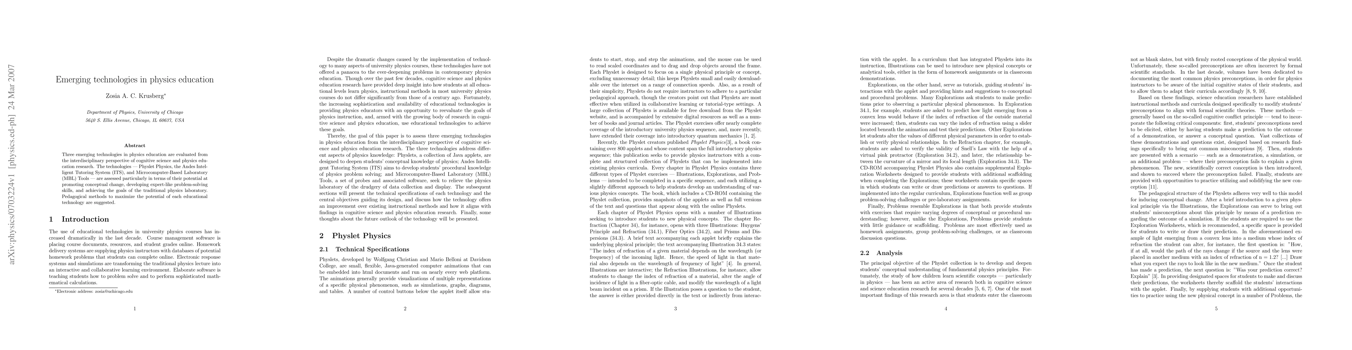 This paper evaluates three emerging technologies in physics education: Physlet Physics, Andes ITS, and MBL Tools, to promote conceptual change and expert-like problem-solving skills. It suggests pedagogical methods to maximize the potential of each technology.