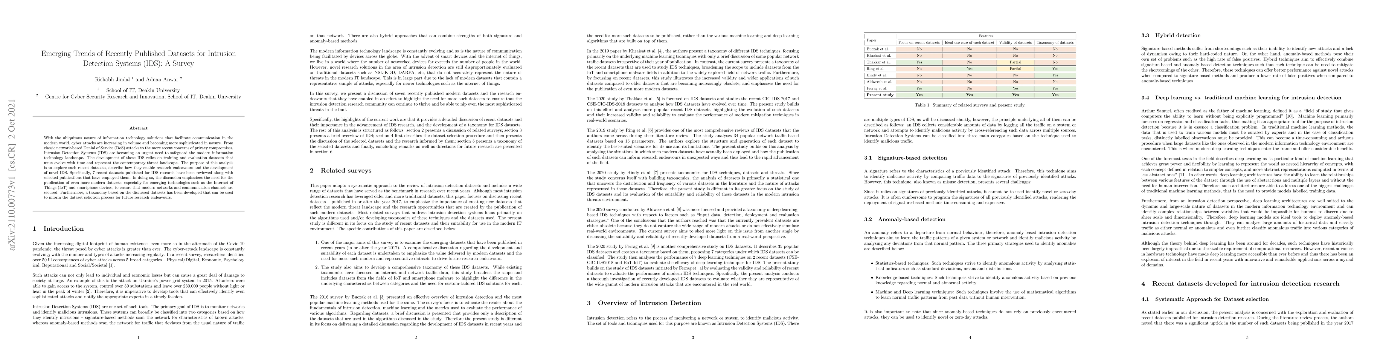 A survey of 7 recent datasets for Intrusion Detection Systems (IDS) reveals a need for more modern datasets, particularly for emerging technologies like IoT and smartphone devices. The study aims to inform dataset selection for future research endeavours by developing a taxonomy based on the discussed datasets.