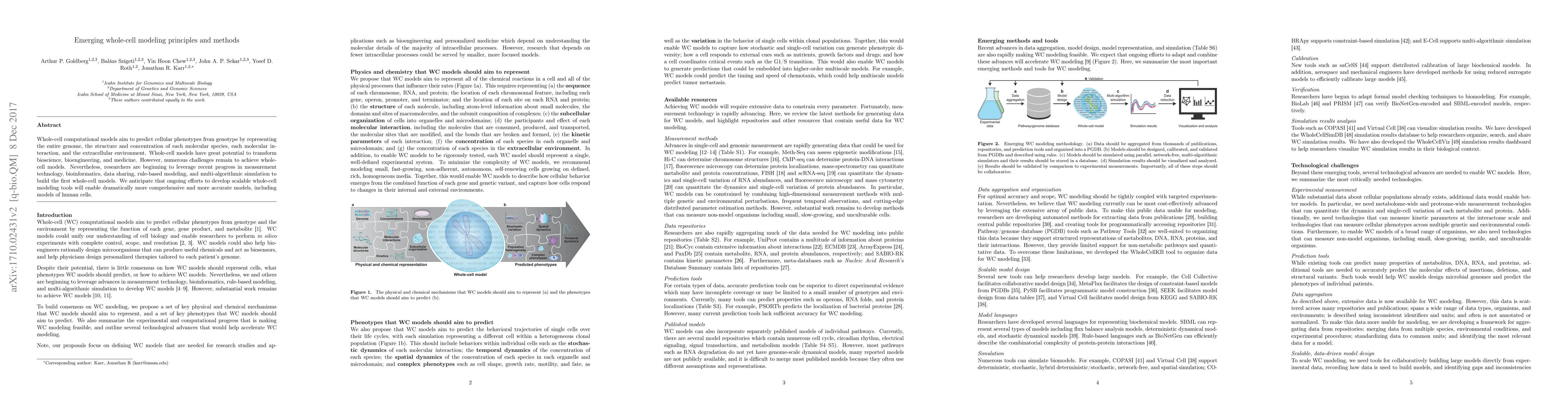 This paper discusses the principles and methods for developing whole-cell computational models that predict cellular phenotypes from genotype. It highlights the challenges and recent advancements in technology and simulation that enable the creation of these comprehensive models, with the potential to revolutionize bioscience, bioengineering, and medicine.