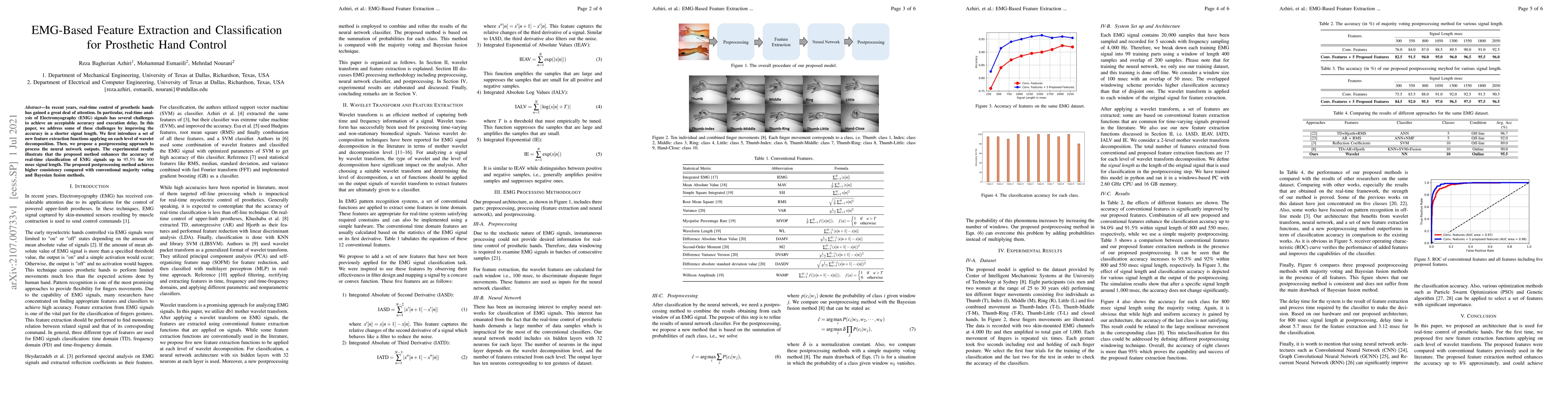 In recent years, real-time control of prosthetic hands has gained a great deal of attention. In particular, real-time analysis of Electromyography (EMG) signals has several challenges to achieve an acceptable accuracy and execution delay. In this paper, we address some of these challenges by improving the accuracy in a shorter signal length. We first introduce a set of new feature extraction functions applying on each level of wavelet decomposition. Then, we propose a postprocessing approach to process the neural network outputs. The experimental results illustrate that the proposed method enhances the accuracy of real-time classification of EMG signals up to $95.5\%$ for $800$ msec signal length. The proposed postprocessing method achieves higher consistency compared with conventional majority voting and Bayesian fusion methods.