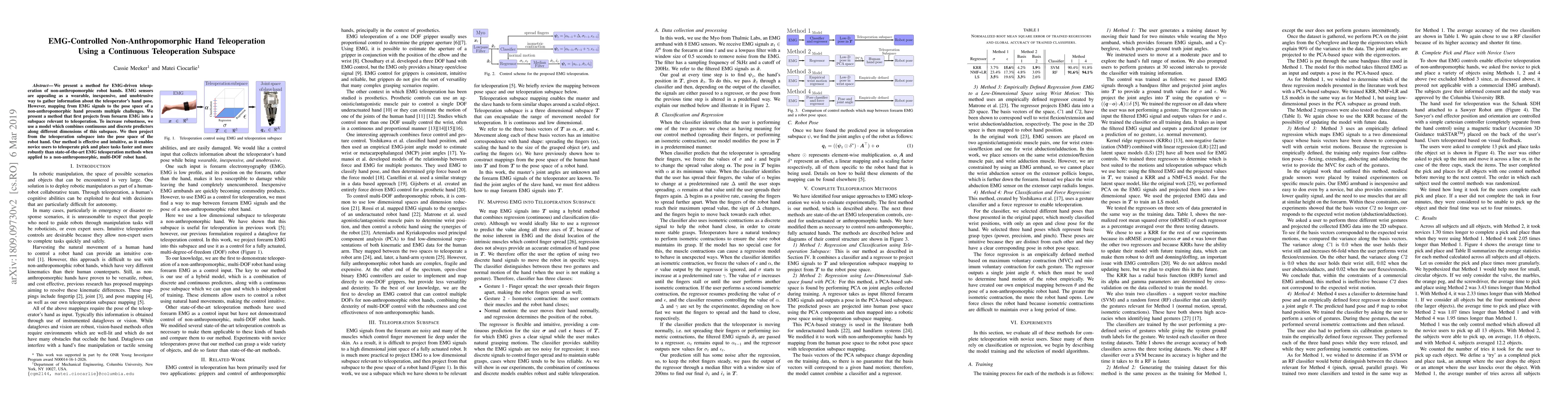 This paper introduces an EMG-driven teleoperation method for controlling non-anthropomorphic robot hands, projecting EMG signals into a relevant teleoperation subspace and using a combined continuous and discrete model for robustness. The method enables novice users to perform pick and place tasks more efficiently than existing methods.