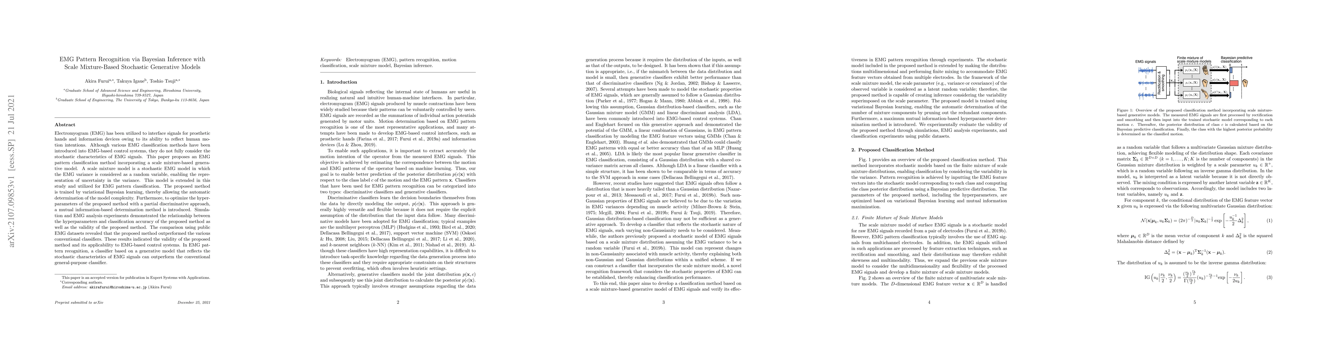 This paper proposes an advanced EMG pattern classification method using a scale mixture-based stochastic generative model and Bayesian inference. The method outperforms conventional classifiers by better accounting for the stochastic characteristics of EMG signals, as demonstrated through experiments and comparisons with public datasets.