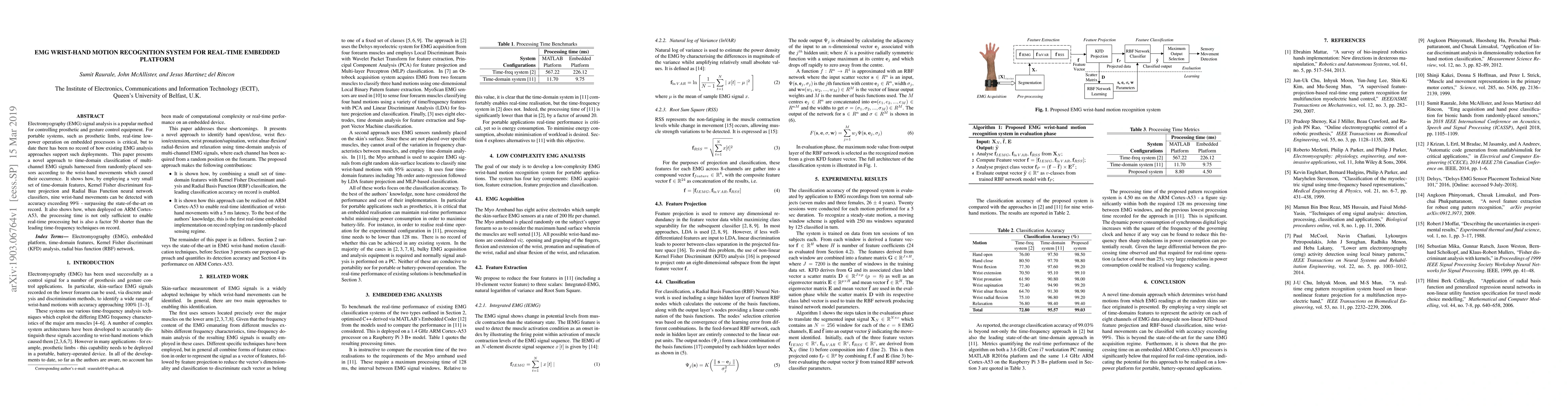 Electromyography (EMG) signal analysis is a popular method for controlling prosthetic and gesture control equipment. For portable systems, such as prosthetic limbs, real-time low-power operation on embedded processors is critical, but to date, there has been no record of how existing EMG analysis approaches support such deployments. This paper presents a novel approach to time-domain classification of multi-channel EMG signals harnessed from randomly-placed sensors according to the wrist-hand movements which caused their occurrence. It shows how, by employing a very small set of time-domain features, Kernel Fisher discriminant feature projection and Radial Bias Function neural network classifiers, nine wrist-hand movements can be detected with accuracy exceeding 99% - surpassing the state-of-the-art on record. It also shows how, when deployed on ARM Cortex-A53, the processing time is not only sufficient to enable real-time processing but is also a factor 50 shorter than the leading time-frequency techniques on record.