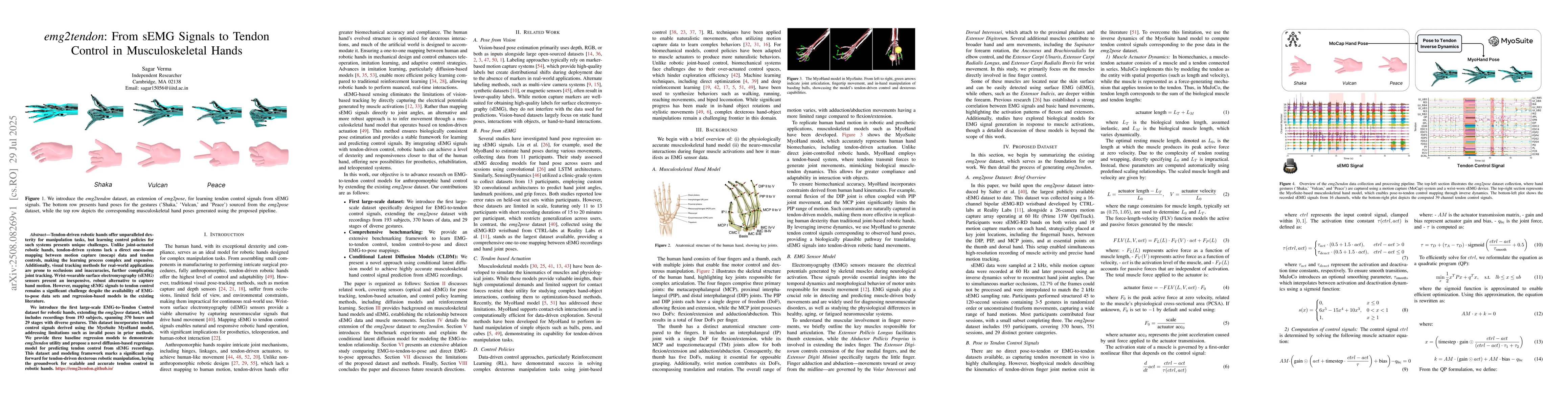 Tendon-driven robotic hands offer unparalleled dexterity for manipulation tasks, but learning control policies for such systems presents unique challenges. Unlike joint-actuated robotic hands, tendon-driven systems lack a direct one-to-one mapping between motion capture (mocap) data and tendon controls, making the learning process complex and expensive. Additionally, visual tracking methods for real-world applications are prone to occlusions and inaccuracies, further complicating joint tracking. Wrist-wearable surface electromyography (sEMG) sensors present an inexpensive, robust alternative to capture hand motion. However, mapping sEMG signals to tendon control remains a significant challenge despite the availability of EMG-to-pose data sets and regression-based models in the existing literature. We introduce the first large-scale EMG-to-Tendon Control dataset for robotic hands, extending the emg2pose dataset, which includes recordings from 193 subjects, spanning 370 hours and 29 stages with diverse gestures. This dataset incorporates tendon control signals derived using the MyoSuite MyoHand model, addressing limitations such as invalid poses in prior methods. We provide three baseline regression models to demonstrate emg2tendon utility and propose a novel diffusion-based regression model for predicting tendon control from sEMG recordings. This dataset and modeling framework marks a significant step forward for tendon-driven dexterous robotic manipulation, laying the groundwork for scalable and accurate tendon control in robotic hands. https://emg2tendon.github.io/