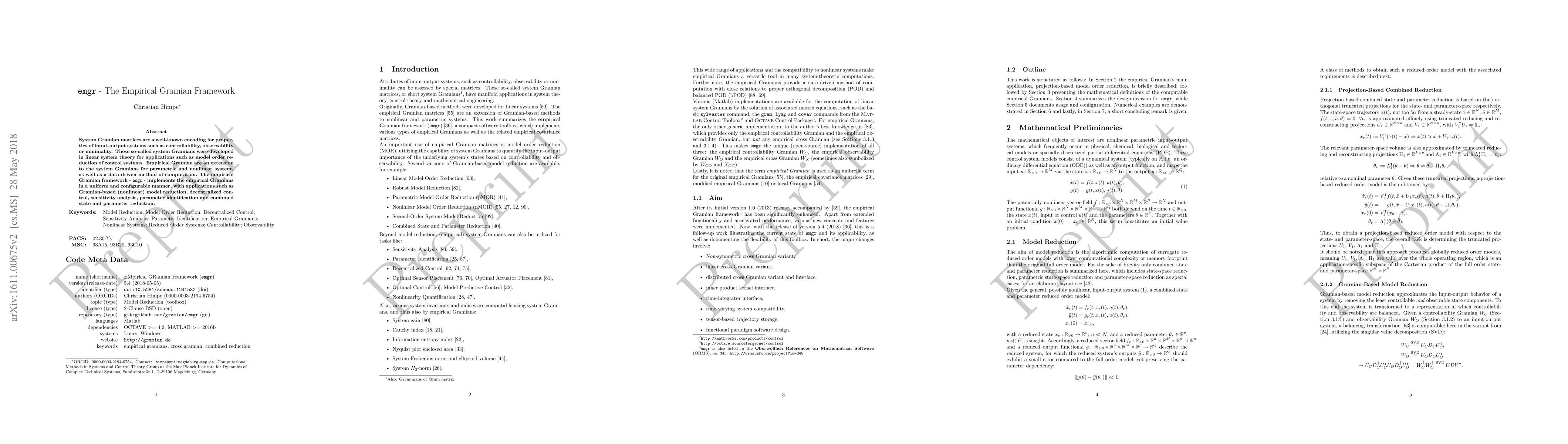 System Gramian matrices are a well-known encoding for properties of input-output systems such as controllability, observability or minimality. These so-called system Gramians were developed in linear system theory for applications such as model order reduction of control systems. Empirical Gramian are an extension to the system Gramians for parametric and nonlinear systems as well as a data-driven method of computation. The empirical Gramian framework - emgr - implements the empirical Gramians in a uniform and configurable manner, with applications such as Gramian-based (nonlinear) model reduction, decentralized control, sensitivity analysis, parameter identification and combined state and parameter reduction.