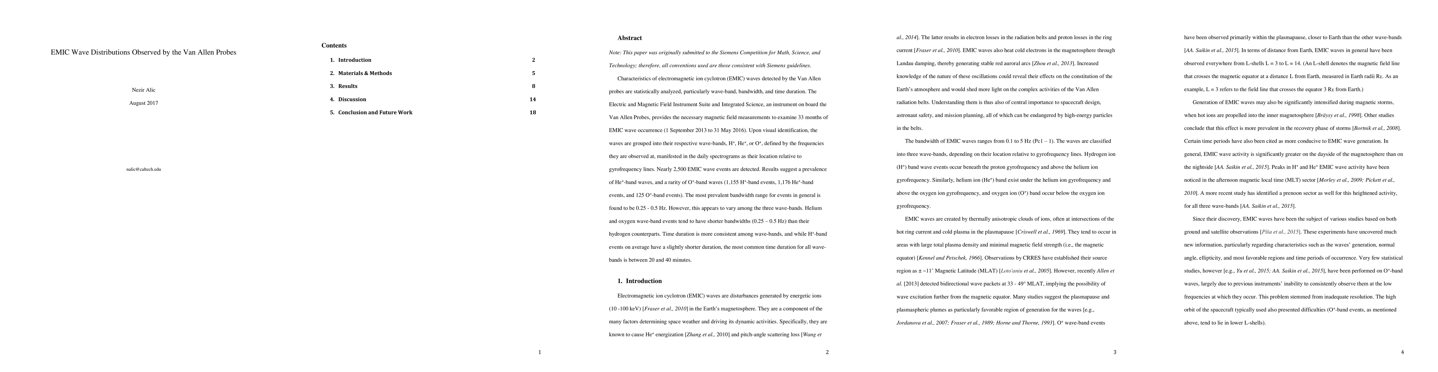 This study statistically analyzes electromagnetic ion cyclotron (EMIC) waves detected by the Van Allen Probes, identifying nearly 2,500 events over 33 months. The analysis reveals a prevalence of He+-band waves with a common bandwidth of 0.25-0.5 Hz, while O+-band waves are rare, and H+-band events have slightly shorter durations on average.