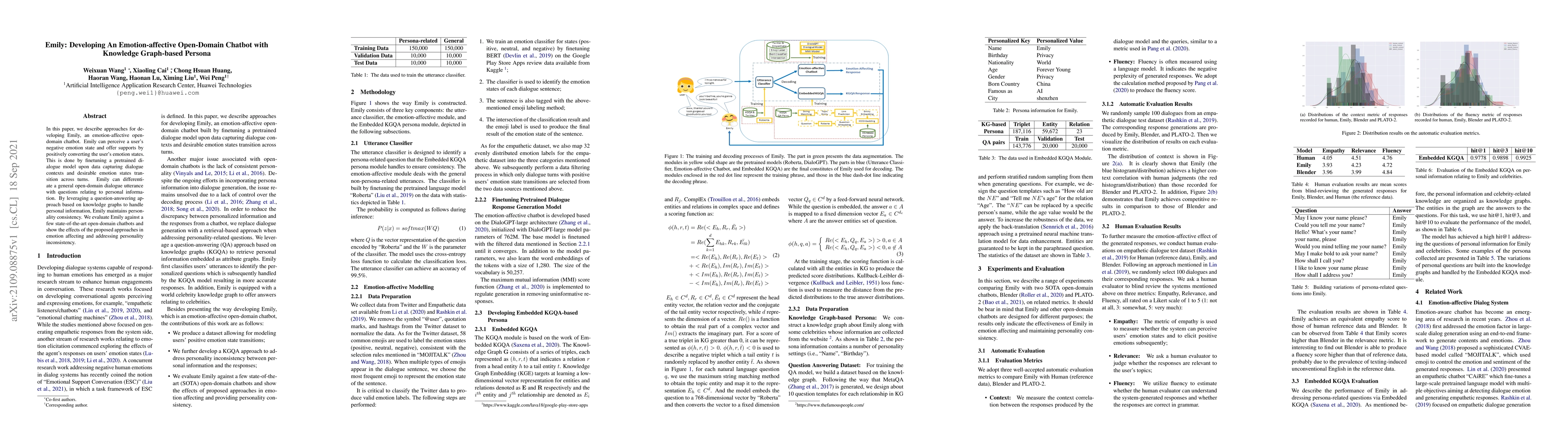 In this paper, we describe approaches for developing Emily, an emotion-affective open-domain chatbot. Emily can perceive a user's negative emotion state and offer supports by positively converting the user's emotion states. This is done by finetuning a pretrained dialogue model upon data capturing dialogue contexts and desirable emotion states transition across turns. Emily can differentiate a general open-domain dialogue utterance with questions relating to personal information. By leveraging a question-answering approach based on knowledge graphs to handle personal information, Emily maintains personality consistency. We evaluate Emily against a few state-of-the-art open-domain chatbots and show the effects of the proposed approaches in emotion affecting and addressing personality inconsistency.