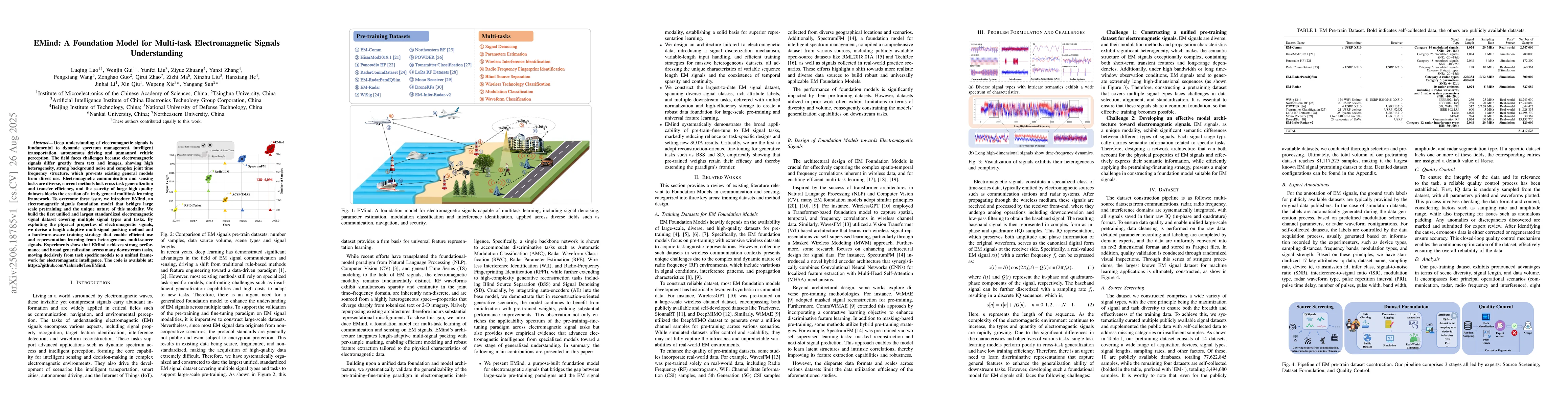 Deep understanding of electromagnetic signals is fundamental to dynamic spectrum management, intelligent transportation, autonomous driving and unmanned vehicle perception. The field faces challenges because electromagnetic signals differ greatly from text and images, showing high heterogeneity, strong background noise and complex joint time frequency structure, which prevents existing general models from direct use. Electromagnetic communication and sensing tasks are diverse, current methods lack cross task generalization and transfer efficiency, and the scarcity of large high quality datasets blocks the creation of a truly general multitask learning framework. To overcome these issue, we introduce EMind, an electromagnetic signals foundation model that bridges large scale pretraining and the unique nature of this modality. We build the first unified and largest standardized electromagnetic signal dataset covering multiple signal types and tasks. By exploiting the physical properties of electromagnetic signals, we devise a length adaptive multi-signal packing method and a hardware-aware training strategy that enable efficient use and representation learning from heterogeneous multi-source signals. Experiments show that EMind achieves strong performance and broad generalization across many downstream tasks, moving decisively from task specific models to a unified framework for electromagnetic intelligence. The code is available at: https://github.com/GabrielleTse/EMind.