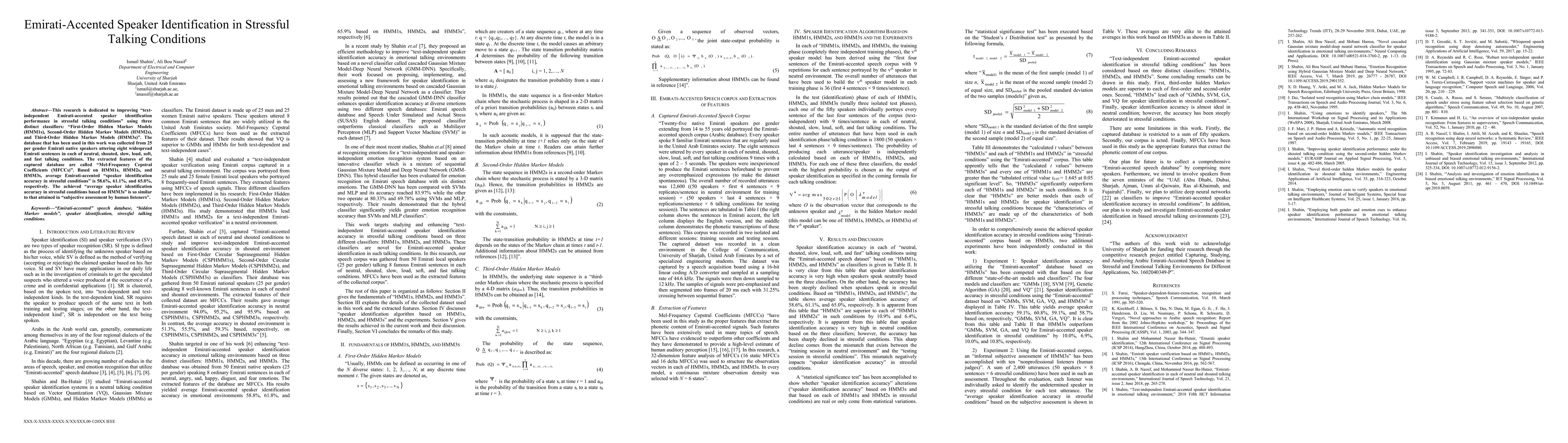 This research is dedicated to improving text-independent Emirati-accented speaker identification performance in stressful talking conditions using three distinct classifiers: First-Order Hidden Markov Models (HMM1s), Second-Order Hidden Markov Models (HMM2s), and Third-Order Hidden Markov Models (HMM3s). The database that has been used in this work was collected from 25 per gender Emirati native speakers uttering eight widespread Emirati sentences in each of neutral, shouted, slow, loud, soft, and fast talking conditions. The extracted features of the captured database are called Mel-Frequency Cepstral Coefficients (MFCCs). Based on HMM1s, HMM2s, and HMM3s, average Emirati-accented speaker identification accuracy in stressful conditions is 58.6%, 61.1%, and 65.0%, respectively. The achieved average speaker identification accuracy in stressful conditions based on HMM3s is so similar to that attained in subjective assessment by human listeners.