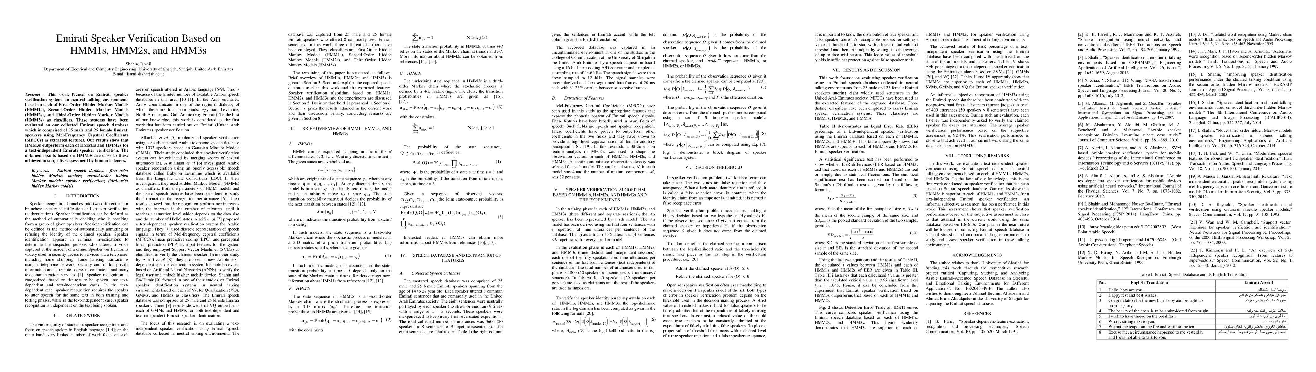 This research evaluates Emirati speaker verification systems using HMM1s, HMM2s, and HMM3s, showing that HMM3s provide superior performance compared to HMM1s and HMM2s, especially in text-independent scenarios. The study uses MFCCs and a collected Emirati speech database for evaluation.