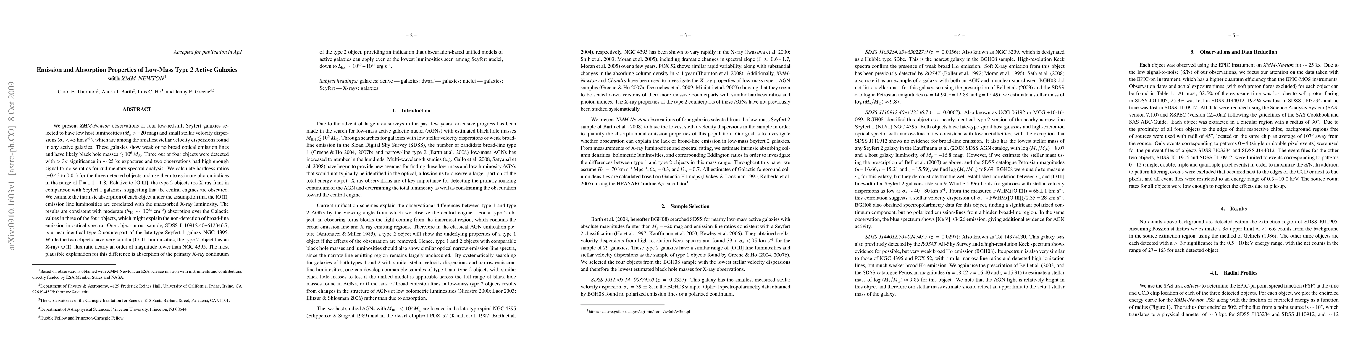 Researchers analyzed XMM-Newton observations of four low-redshift Seyfert galaxies to study their emission and absorption properties, finding that they have likely black hole masses <10^6 M_sun and moderate absorption, which may explain the lack of broad optical lines.