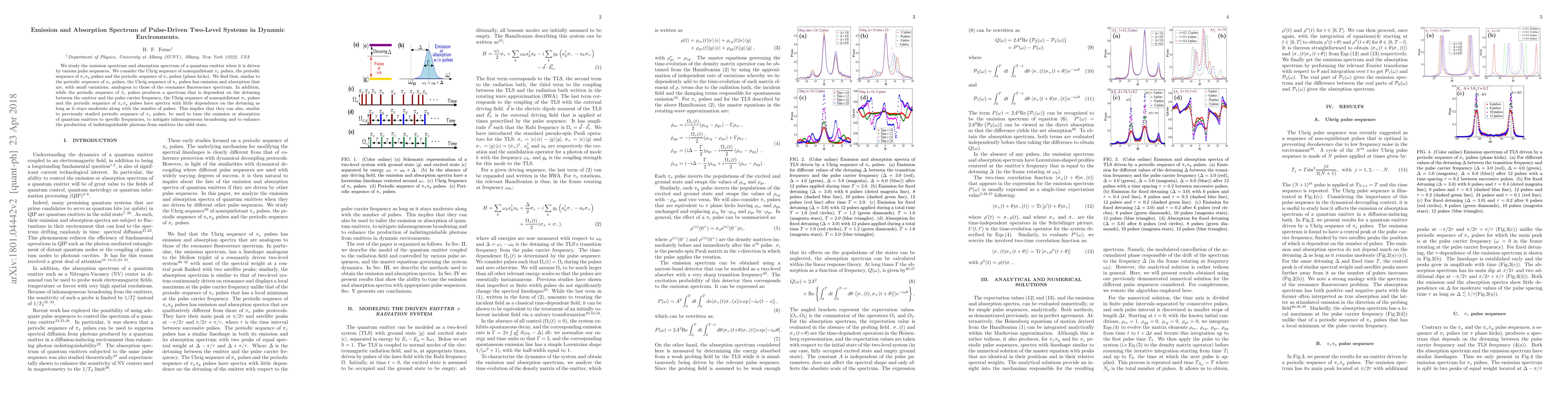 This research examines the emission and absorption spectra of quantum emitters under various pulse sequences, finding that the Uhrig sequence and periodic $\pi_x\pi_y$ pulses maintain spectra similar to resonance fluorescence, while $\pi_z$ pulses show detuning dependence. The studied sequences can tune quantum emitters' spectra and enhance photon production.