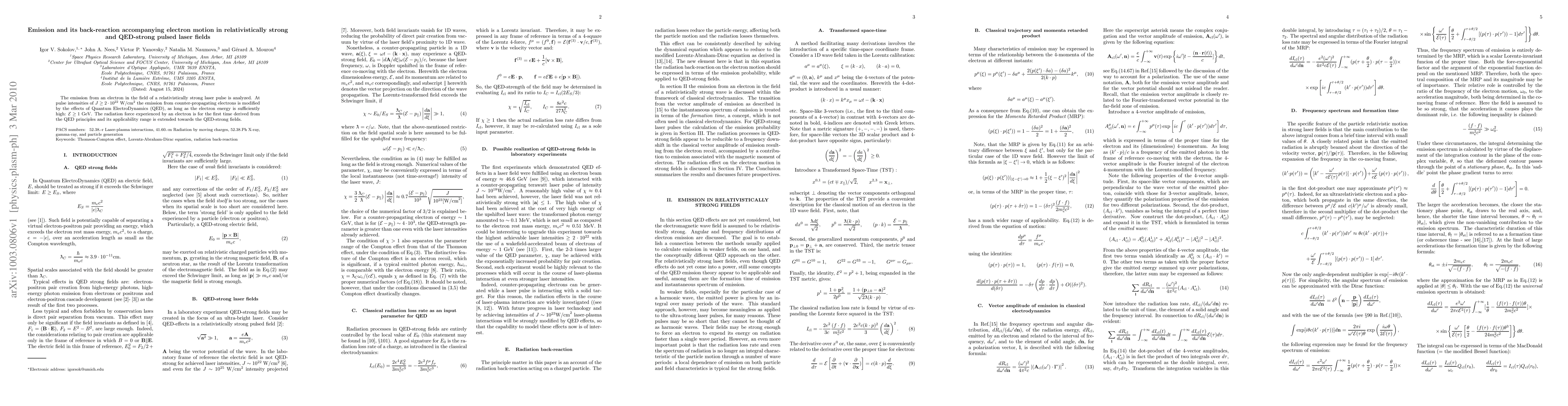 This paper analyzes electron emission in relativistically strong laser pulses, revealing QED effects on counter-propagating electrons at high energies (E > 1 GeV). The study derives the radiation force on electrons from QED principles and extends its applicability to QED-strong fields.