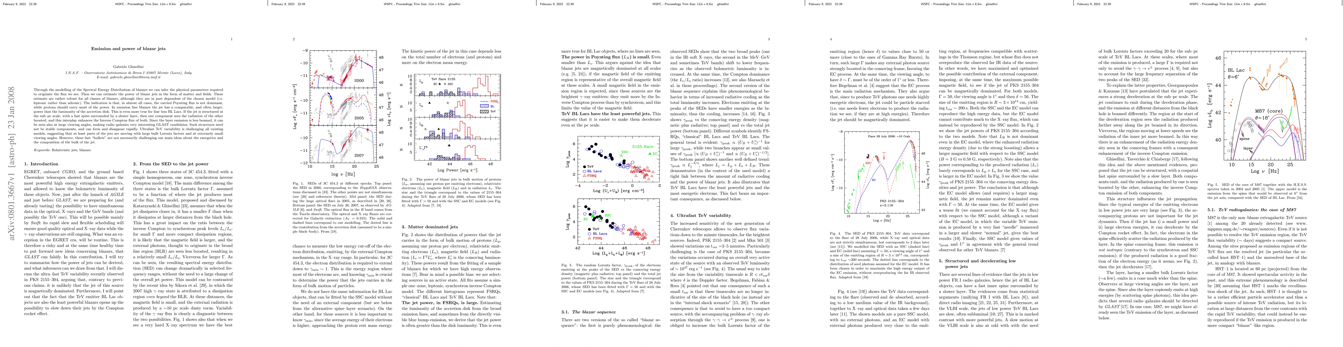 Through the modelling of the Spectral Energy Distribution of blazars we can infer the physical parameters required to originate the flux we see. Then we can estimate the power of blazar jets in the form of matter and fields. These estimates are rather robust for all classes of blazars, although they are in part dependent of the chosen model (i.e. leptonic rather than adronic). The indication is that, in almost all cases, the carried Poynting flux is not dominant, while protons should carry most of the power. In emission line blazars the jet has a comparable, and often larger, power than the luminosity of the accretion disk. This is even more true for line-less BL Lacs. If the jet is structured at the sub-pc scale, with a fast spine surrounded by a slower layer, then one component sees the radiation of the other boosted, and this interplay enhances the Inverse Compton flux of both. Since the layer emission is less beamed, it can be seen also at large viewing angles, making radio-galaxies very interesting GLAST candidates. Such structures need not be stable components, and can form and disappear rapidly. Ultrafast TeV variability is challenging all existing models, suggesting that at least parts of the jets are moving with large bulk Lorentz factors and at extremely small viewing angles. However, these fast "bullets" are not necessarily challenging our main ideas about the energetics and the composition of the bulk of the jet.