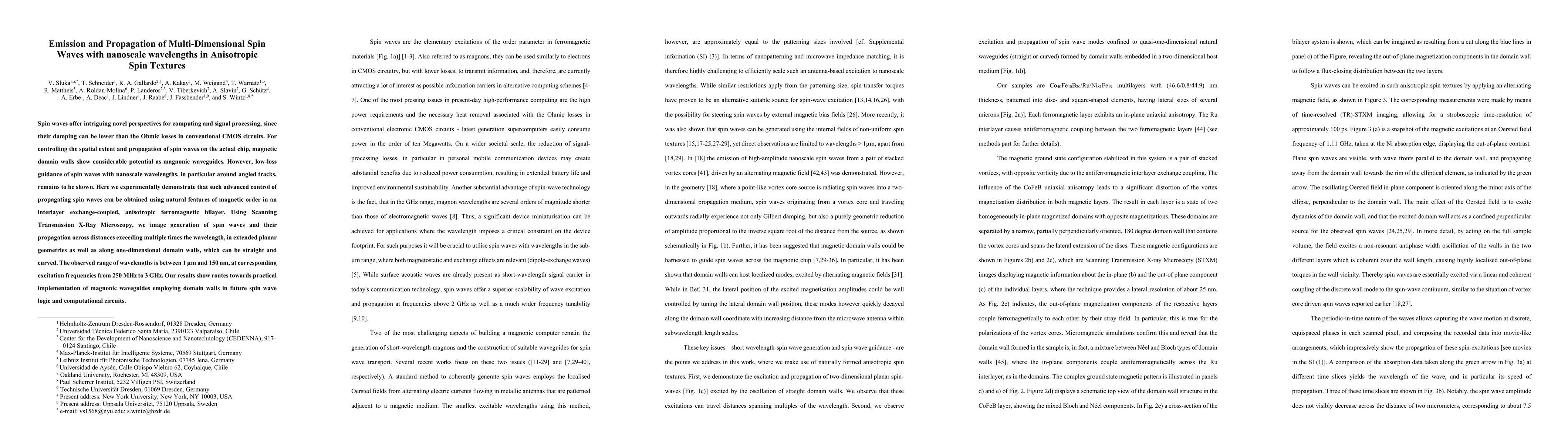 This paper demonstrates the low-loss propagation of multi-dimensional spin waves with nanoscale wavelengths in anisotropic spin textures using interlayer exchange-coupled ferromagnetic bilayers. The study shows successful control of spin wave propagation across extended planar geometries and along curved domain walls, paving the way for future spin wave logic circuits.