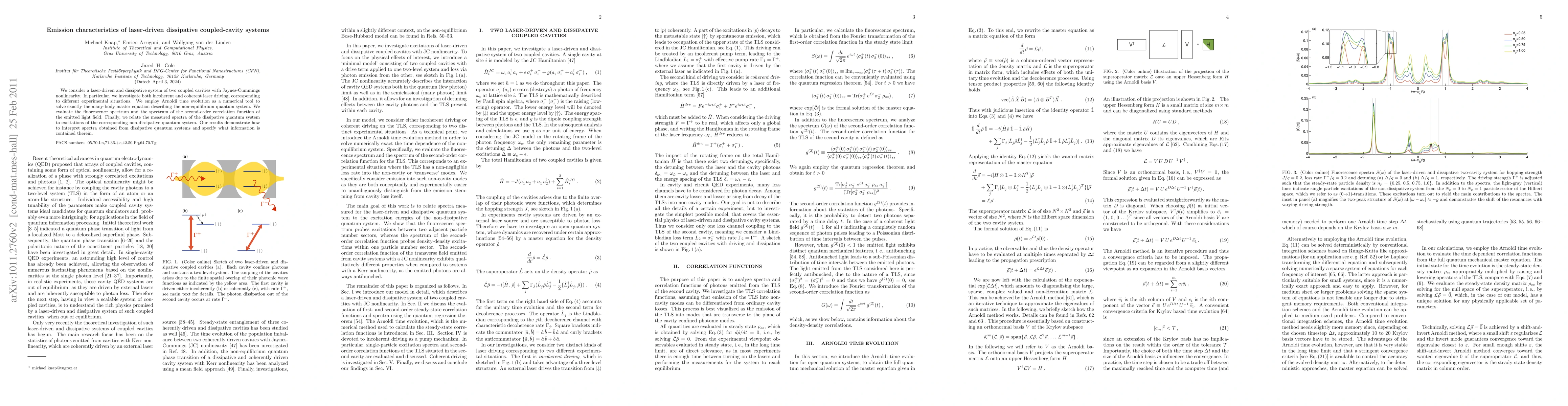 This paper investigates the emission characteristics of laser-driven dissipative coupled-cavities systems using Arnoldi time evolution to solve the many-body master equation, revealing how to interpret spectra from these systems and what information they contain.