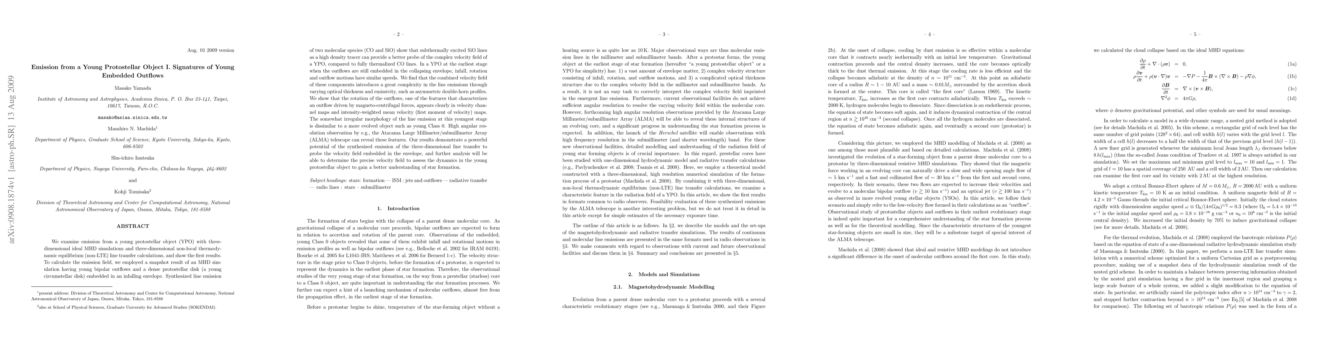 We examine emission from a young protostellar object (YPO) with three-dimensional ideal MHD simulations and three-dimensional non-local thermodynamic equilibrium (non-LTE) line transfer calculations, and show the first results. To calculate the emission field, we employed a snapshot result of an MHD simulation having young bipolar outflows and a dense protostellar disk (a young circumstellar disk) embedded in an infalling envelope. Synthesized line emission of two molecular species (CO and SiO) show that subthermally excited SiO lines as a high density tracer can provide a better probe of the complex velocity field of a YPO, compared to fully thermalized CO lines. In a YPO at the earliest stage when the outflows are still embedded in the collapsing envelope, infall, rotation and outflow motions have similar speeds. We find that the combined velocity field of these components introduces a great complexity in the line emissions through varying optical thickness and emissivity, such as asymmetric double-horn profiles. We show that the rotation of the outflows, one of the features that characterizes an outflow driven by magneto-centrifugal forces, appears clearly in velocity channel maps and intensity-weighted mean velocity (first moment of velocity) maps. The somewhat irregular morphology of the line emission at this youngest stage is dissimilar to a more evolved object such as young Class 0. High angular resolution observation by e.g., the Atacama Large Millimeter/submillimeter Array (ALMA) telescope can reveal these features.