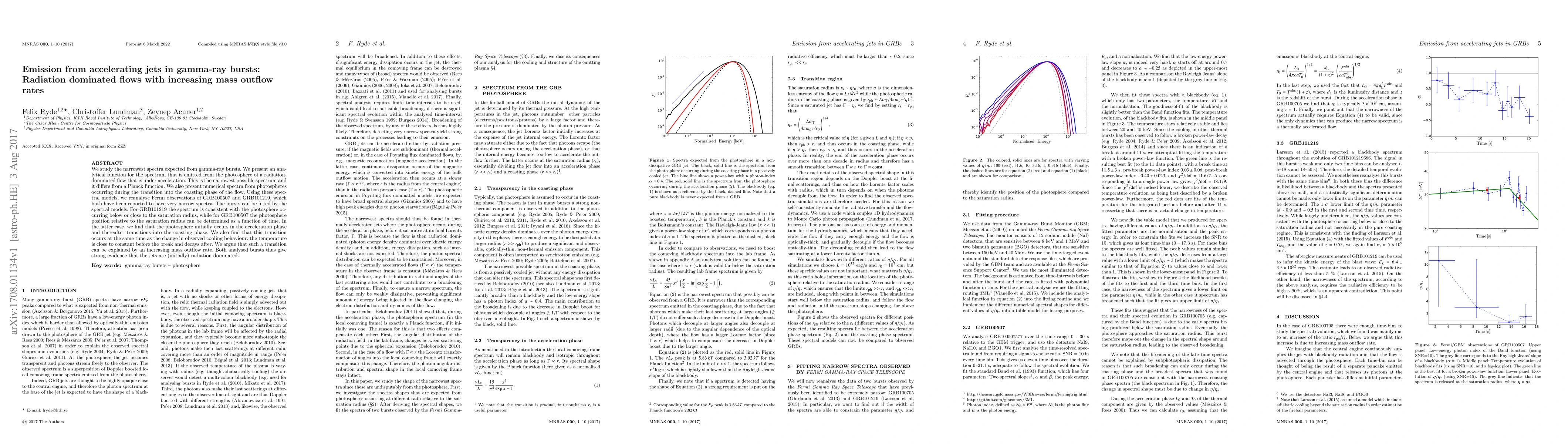 This study presents analytical and numerical spectral models for radiation-dominated, accelerating jets in gamma-ray bursts (GRBs). Applying these models to Fermi observations of GRB100507 and GRB101219, it finds that both bursts' spectra align with the models, suggesting initial radiation-dominated jets. The analysis indicates a transition from acceleration to coasting phase in GRB100507, with cooling behavior changes aligning with an increasing mass outflow rate.